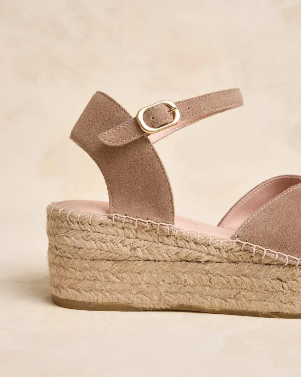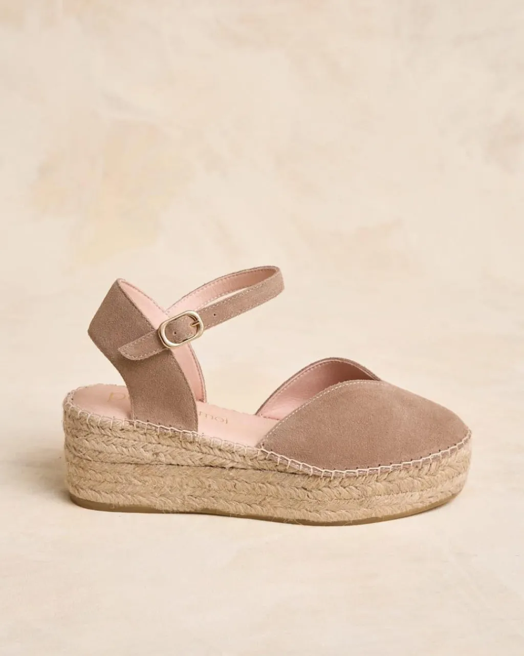 Alpargata con plataforma en color taupe. Punta ligeramente puntiaguda. Sujeción al tobillo mediante hebilla. Escote corazón. Fabricación española de yute natural. La plantilla tiene una almohadilla para mayor comodidad. Una alpargata perfecta para todo el día e ideal para combinar con tus jeans favoritos.