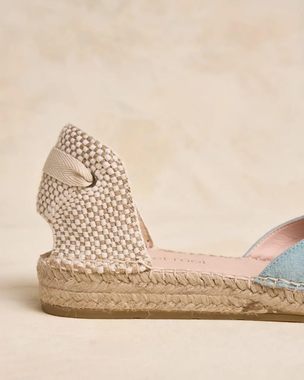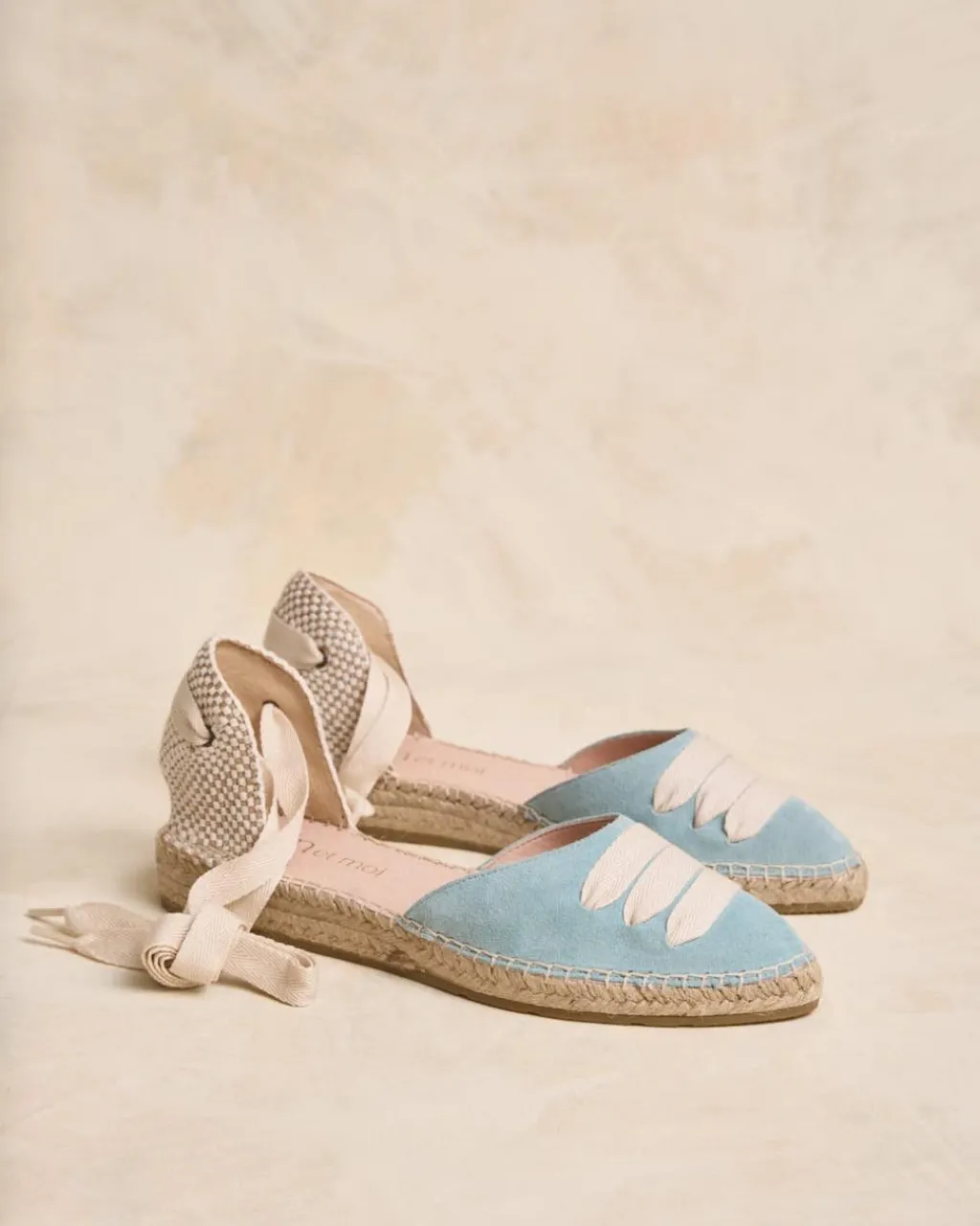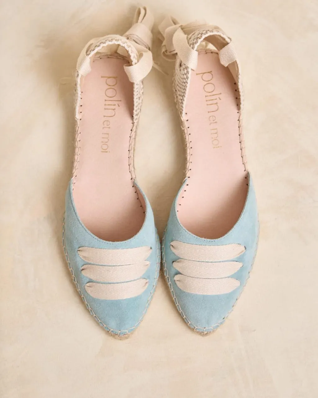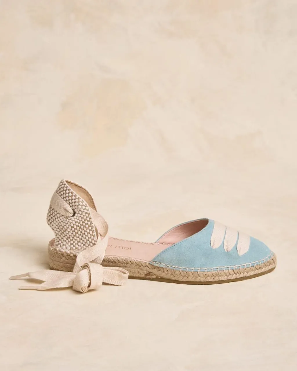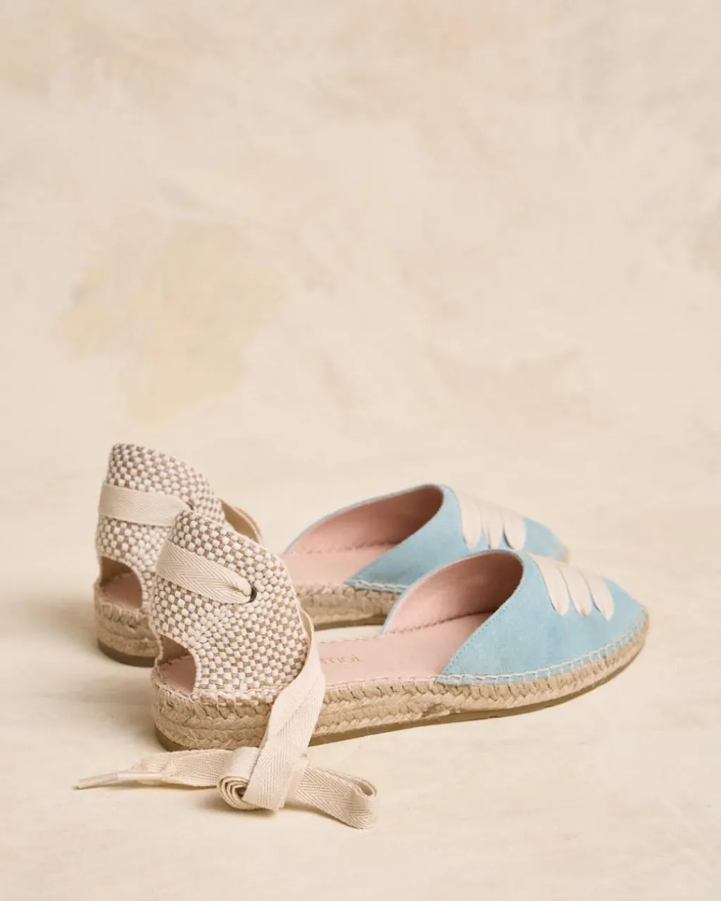 Alpargata plana en serraje en color celeste. Puntera ligeramente en punta con detalle de cintas cruzadas en color crudo. Sujeción al tobillo mediante cinta. Escote redondeado. Fabricación española de yute natural. La plantilla tiene una almohadilla para mayor comodidad. Una alpargata original y cómoda para el día a día.