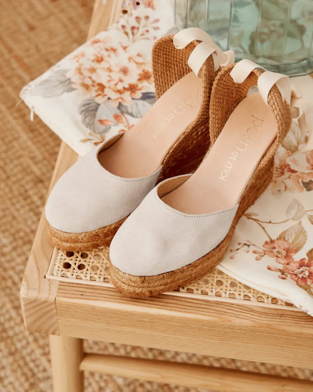 Alpargata de plataforma en serraje de color crudo. Sujeción al tobillo cintas en color blanco. Escote abierto redondo. Talonera cosida con hilo y esparto. Fabricación española de yute natural. La plantilla tiene una almohadilla para mayor comodidad. Una alpargata perfecta para todo el día e ideal para combinar con tus looks de primavera y verano favoritos. Diseñado y fabricado en España.