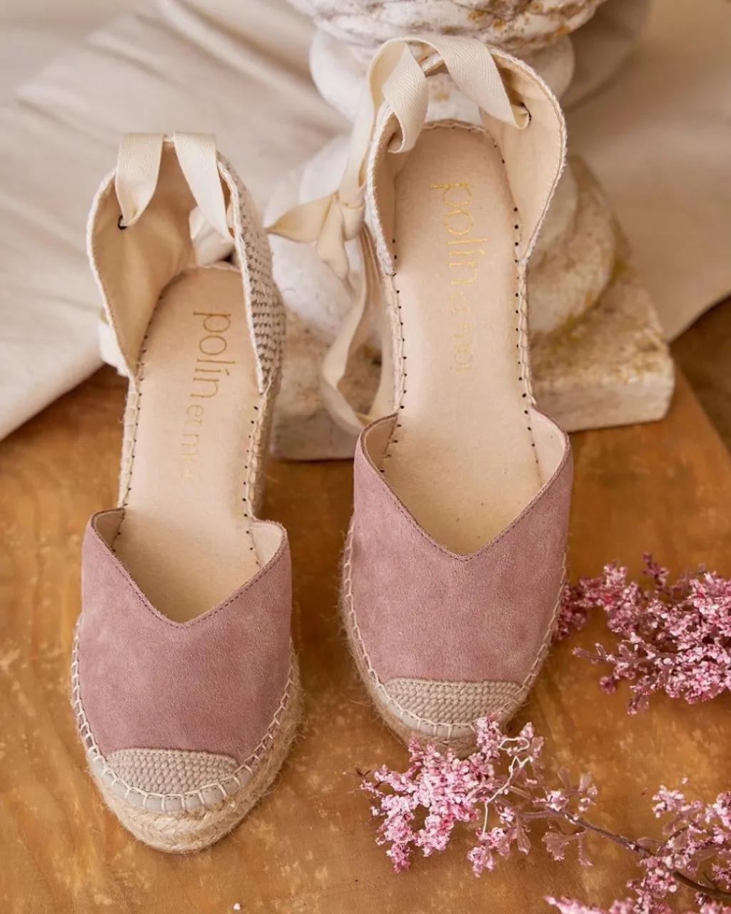 Alpargata de plataforma en ante de color malva. Sujeción al tobillo cintas en color crudo. Escote abierto en forma de corazón. Fabricación española de yute natural. La plantilla tiene una almohadilla para mayor comodidad. Una alpargata estilosa y femenina para el día a día. Diseñado y fabricado en España.