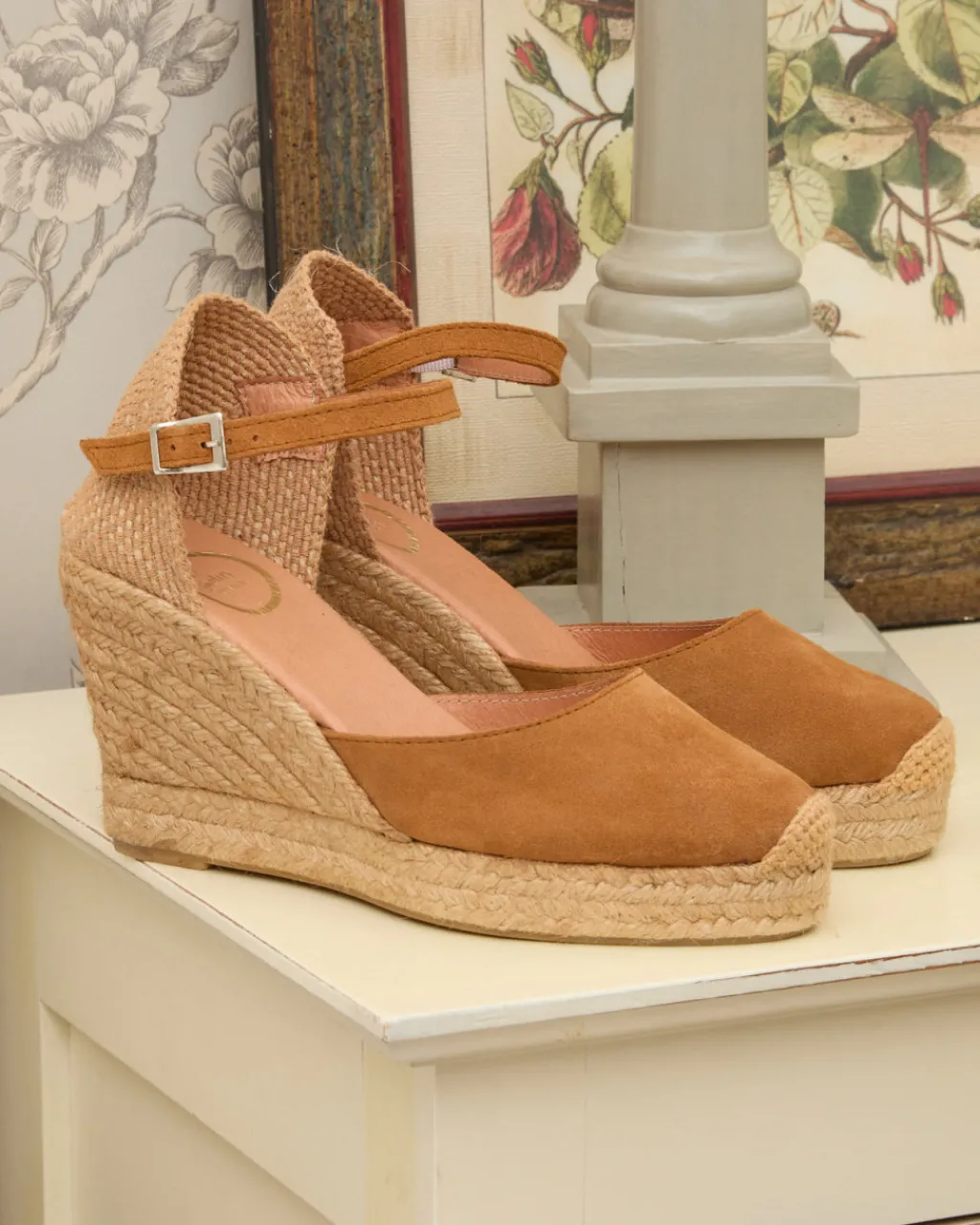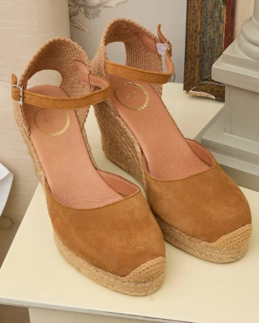 Alpargata de cuña en piel de serraje color camel. Punta ligeramente redonda. Cierre mediante tira en el mismo tejido y hebilla lateral. Talonera de cosida con hilo y esparto. Fabricación artesana de yute natural. Plantilla de la alpargata con almohadilla para mayor comodidad. Un diseño clásico e ideal para acompañar tus looks en cualquier ocasión. Diseñado y fabricado en España.