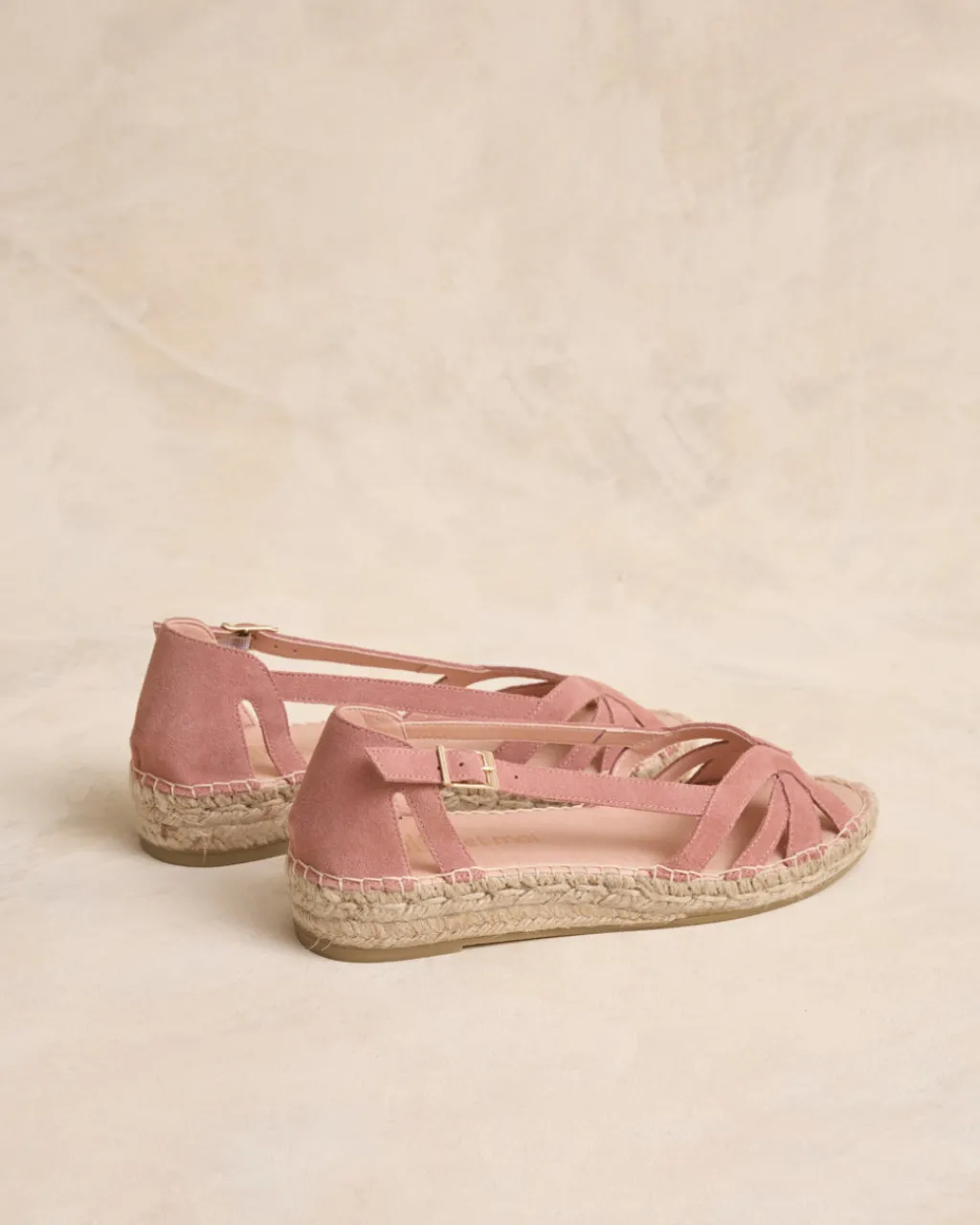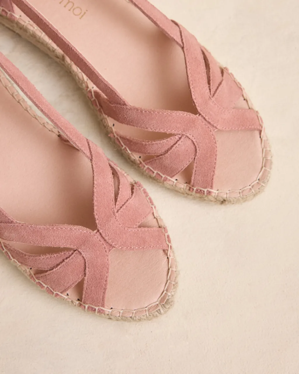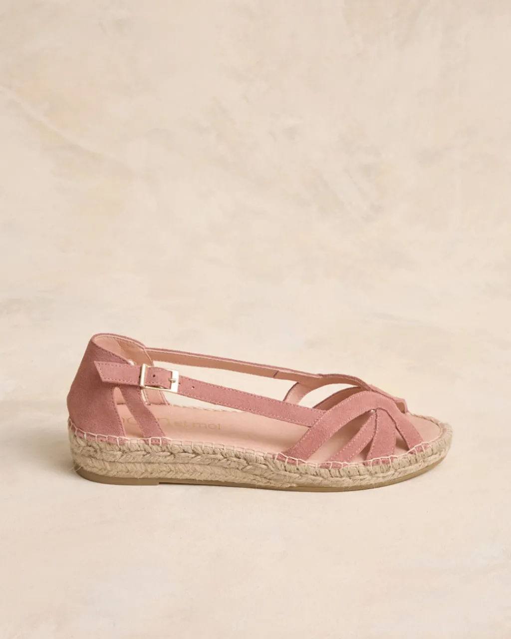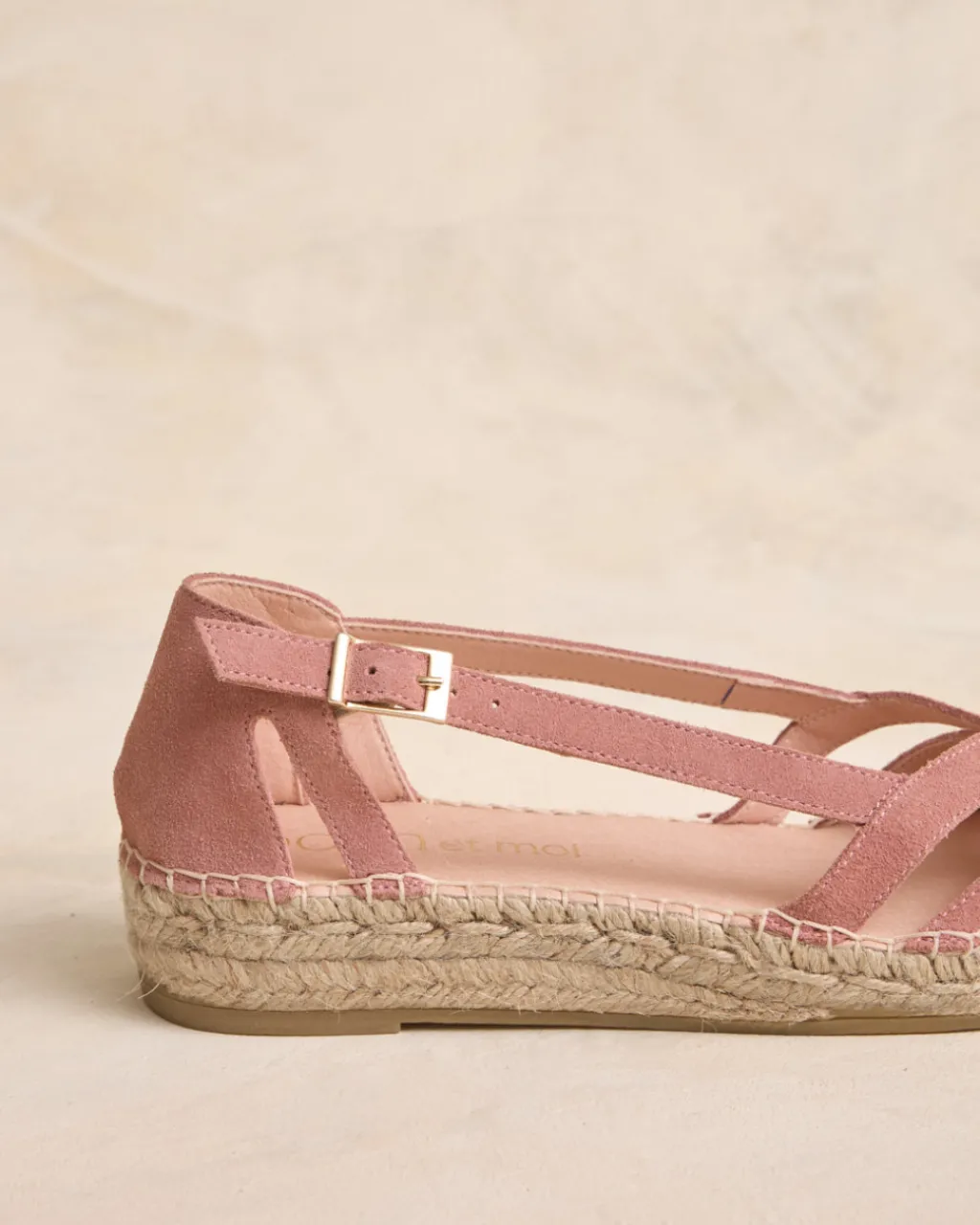 Alpargata plana en serraje en tono maquillaje. Puntera ligeramente en punta con detalle de cintas cruzadas. Cierre al empeine mediante hebilla. Escote en forma de corazón. Fabricación española de yute natural. La plantilla tiene una almohadilla para mayor comodidad. Una alpargata original y cómoda para el día a día.