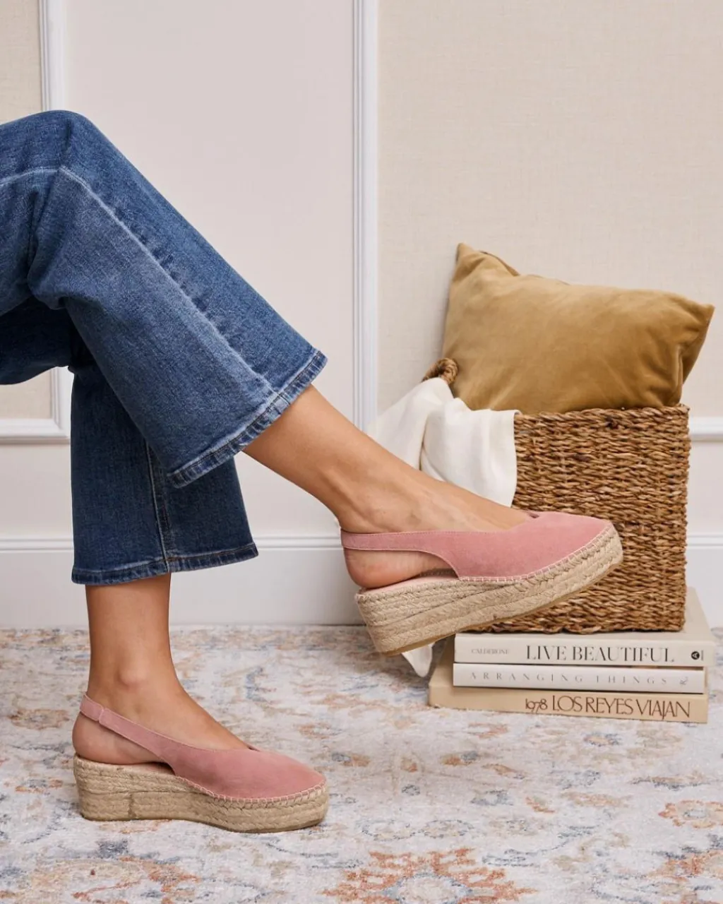 Alpargata destalonada de cuña en serraje en color rosa. Puntera redondeada. Escote en pico. Cierre mediante correa al talón. Fabricación española de yute natural. La plantilla tiene una almohadilla para mayor comodidad. Una alpargata original que puedes combinar con tus looks favoritos esta temporada.