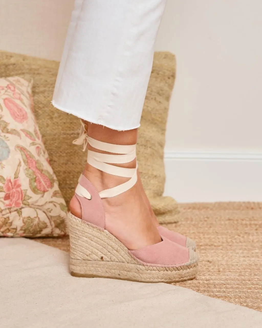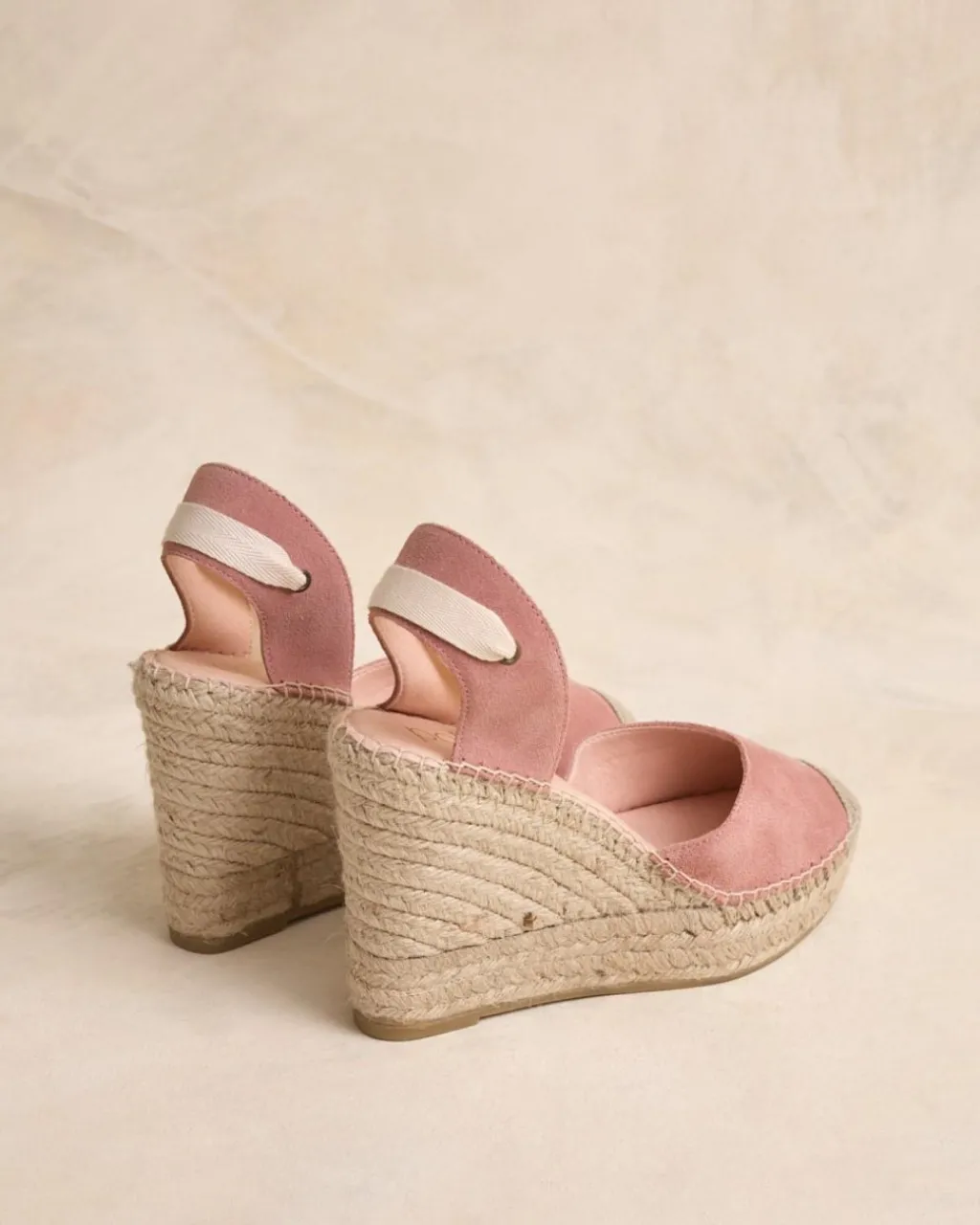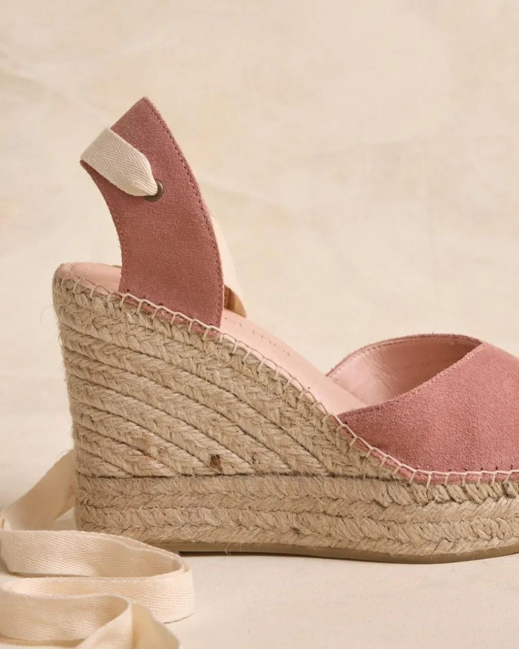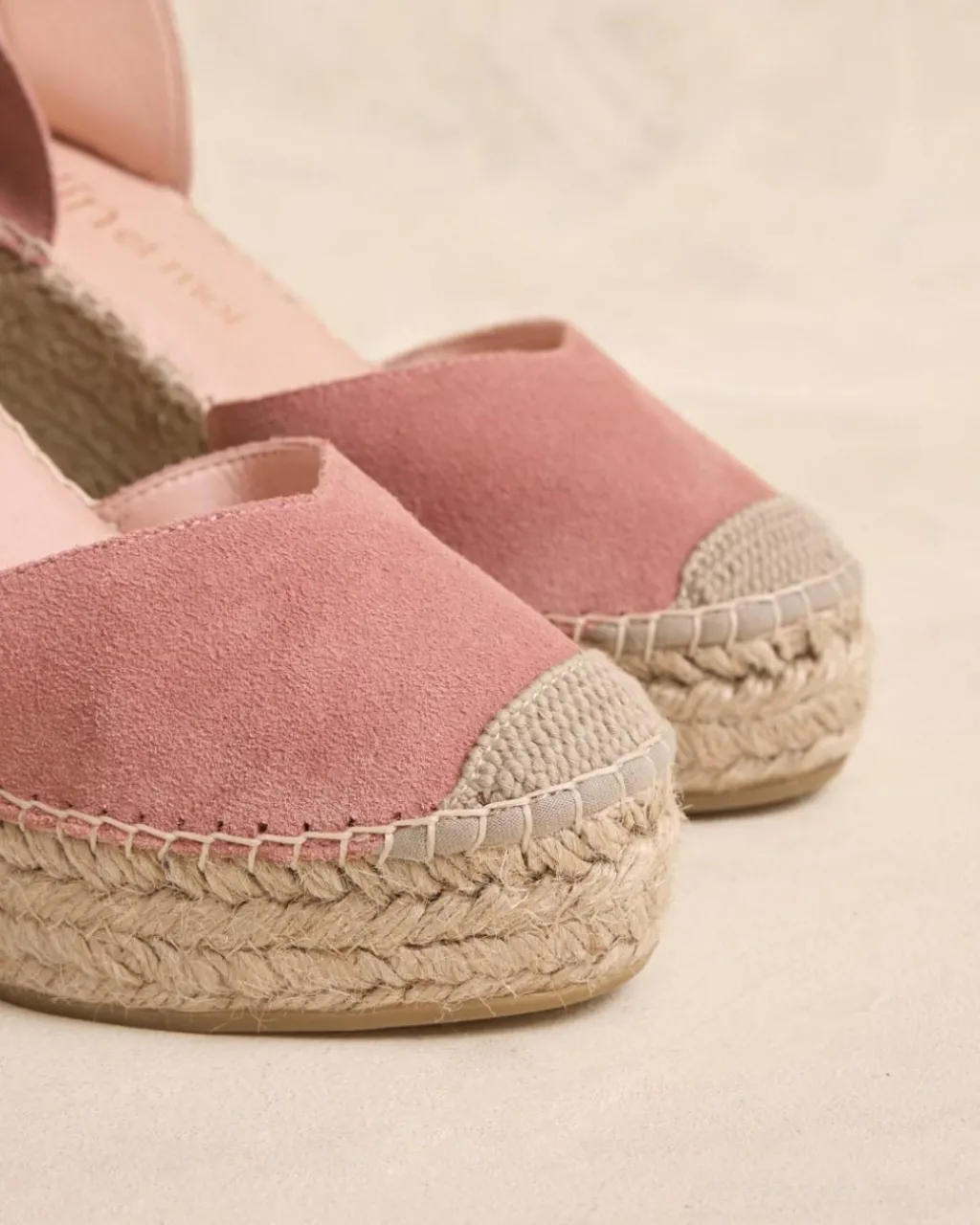 Alpargata con plataforma en ante en color rosa. Puntera ligeramente redondeada con detalle en la punta de esparto. Sujeción al tobillo con cintas en color crudo. Escote abierto ligeramente en forma de corazón. Fabricación española de yute natural. La plantilla tiene una almohadilla para mayor comodidad. Una alpargata para elevar cualquier look esta temporada. Tallan normal. Si dudas entre dos tallas, te aconsejamos elegir la talla superior.