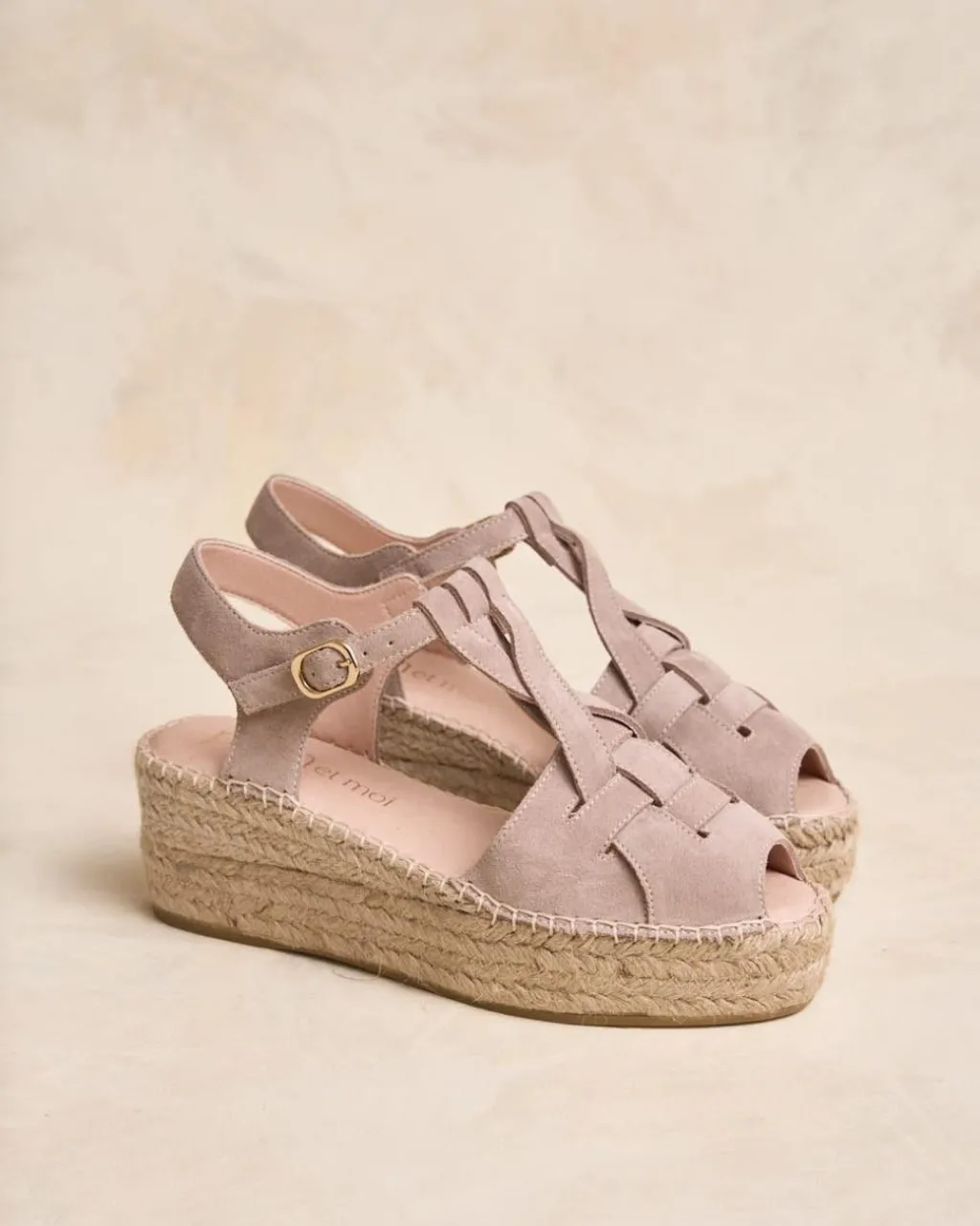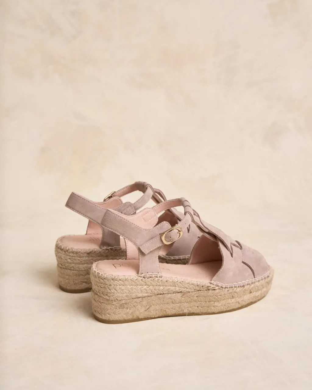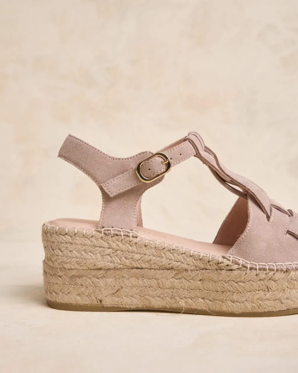 Alpargata con cuña fabricada en ante en color nude. Puntera abierta y redondeada. Diferentes tiras de ante a tono, entrecruzadas sobre el empeine que se juntan con otra tira que permite sujetar la alpargatal tobillo con hebilla. Cuña de tamaño medio y de esparto. Un zapato muy femenino y cómodo para crear looks.