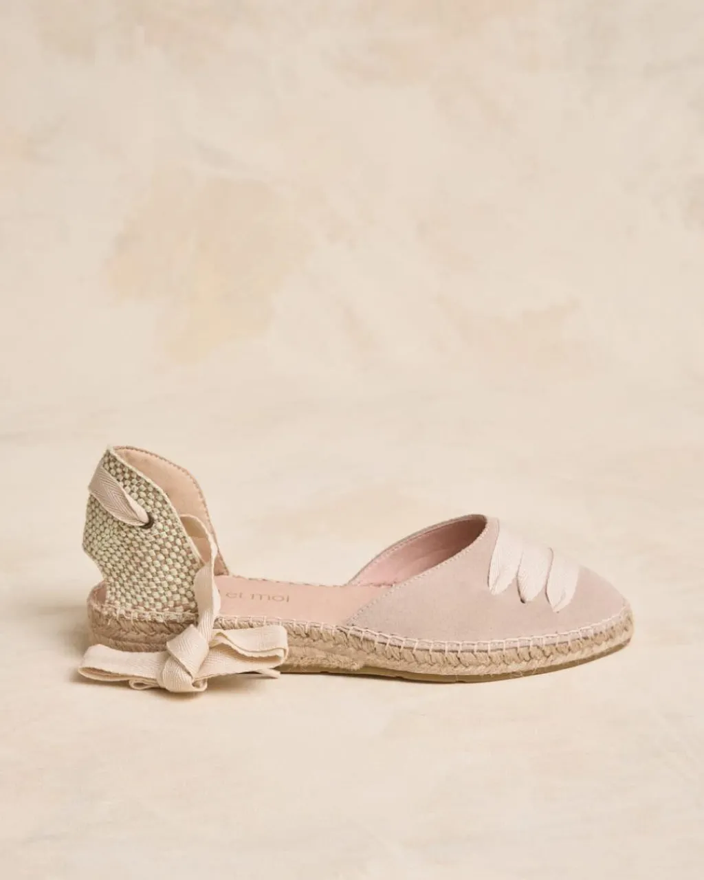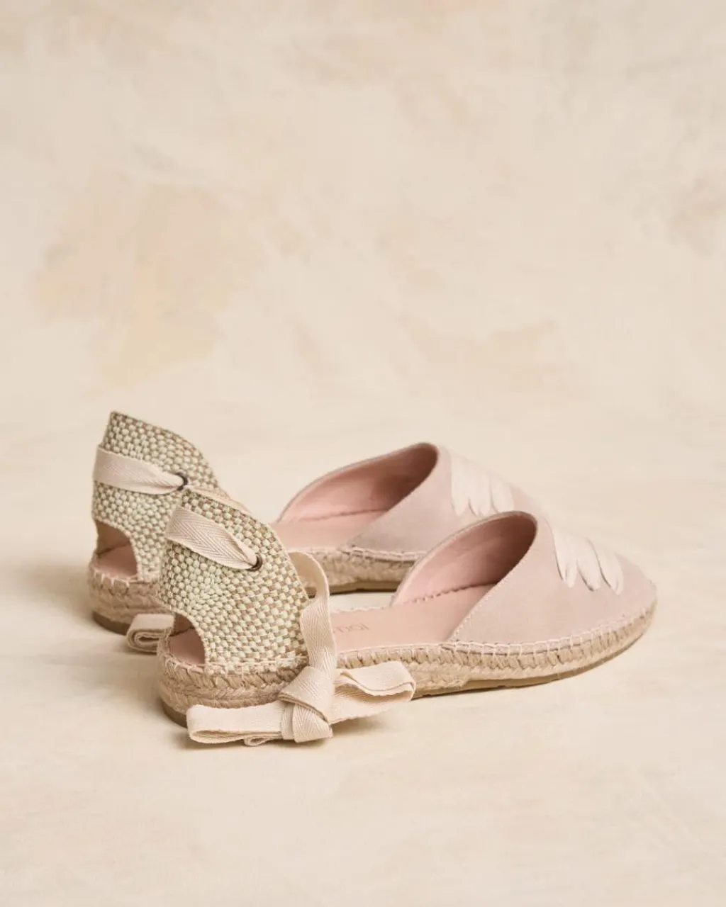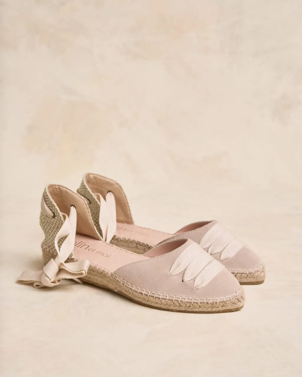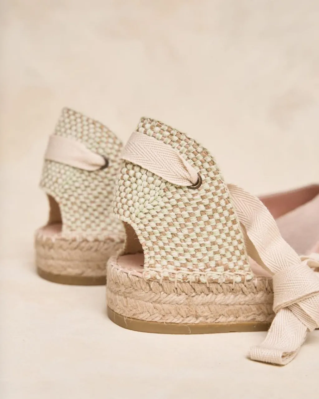 Alpargata plana en serraje en color arena. Puntera ligeramente en punta con detalle de cintas cruzadas en color crudo. Sujeción al tobillo mediante cinta. Escote redondeado. Fabricación española de yute natural. La plantilla tiene una almohadilla para mayor comodidad. Una alpargata original y cómoda para el día a día.