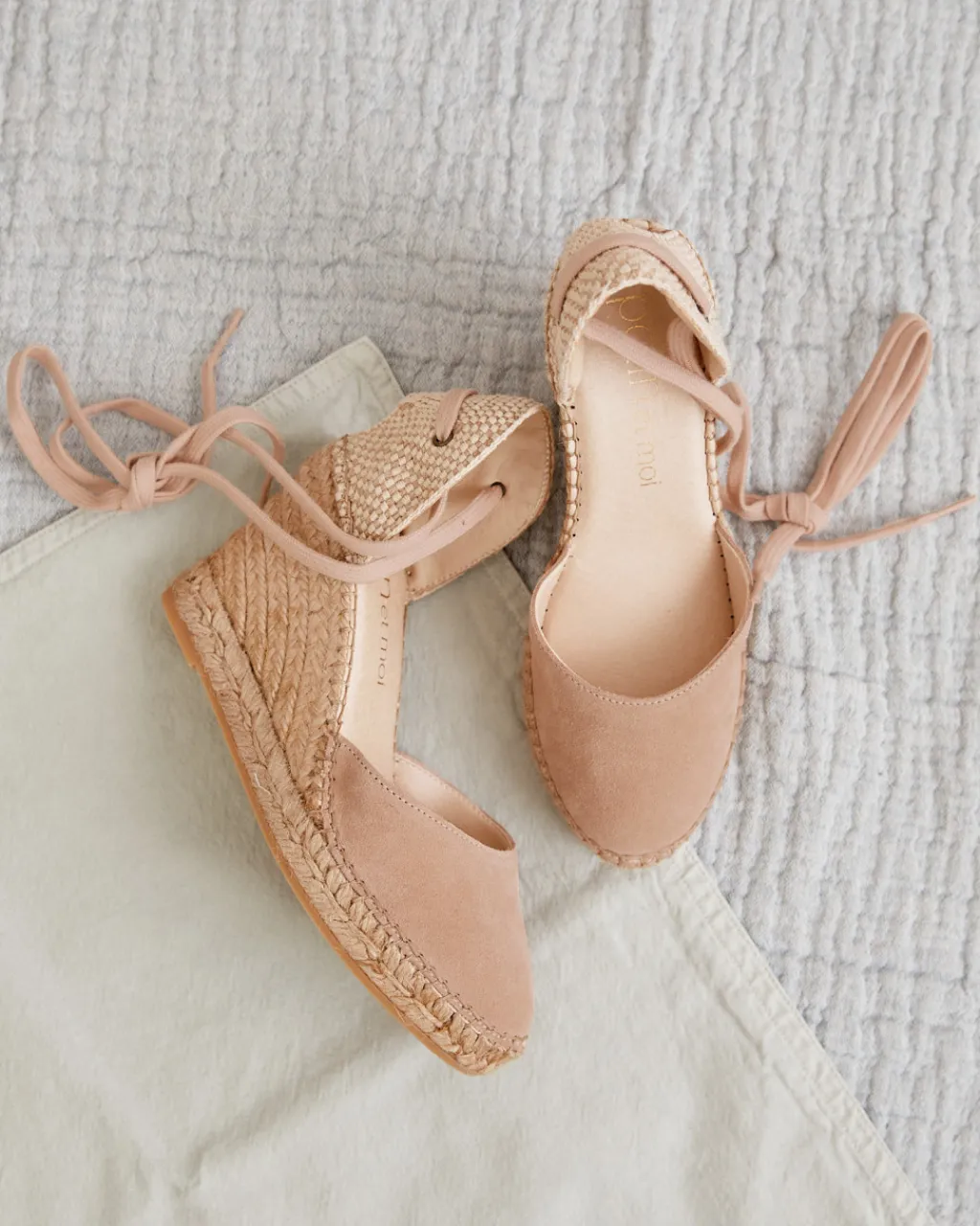 Alpargata de cuña en serraje de color nude. Puntera ligeramente redondeada. Sujeción al tobillo con cordones de algodón en color vainilla. Escote ligeramente redondeado. Talonera cosida con hilo y esparto. Fabricación española de yute natural en color tostado. La plantilla tiene una almohadilla para mayor comodidad. Una alpargata perfecta para combinar con tus looks favoritos. Diseñado y fabricado en España.