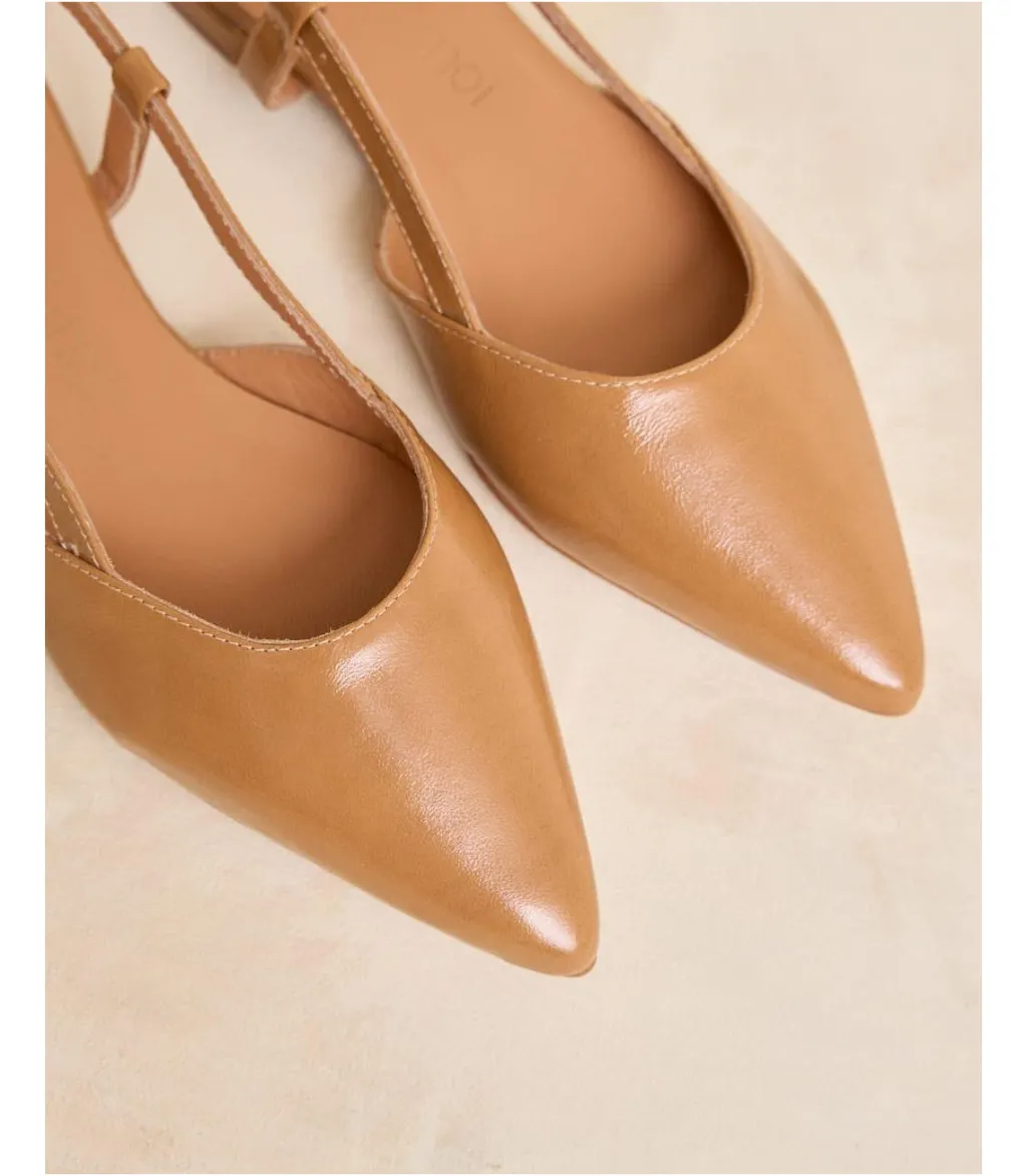 Bailarina de piel destalonada en color cuero. Puntera puntiaguda. Correa con hebilla al talón. Es un calzado diferente y cómodo para combinarlo tanto con pantalones como con vestidos.