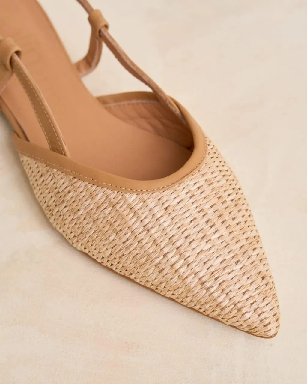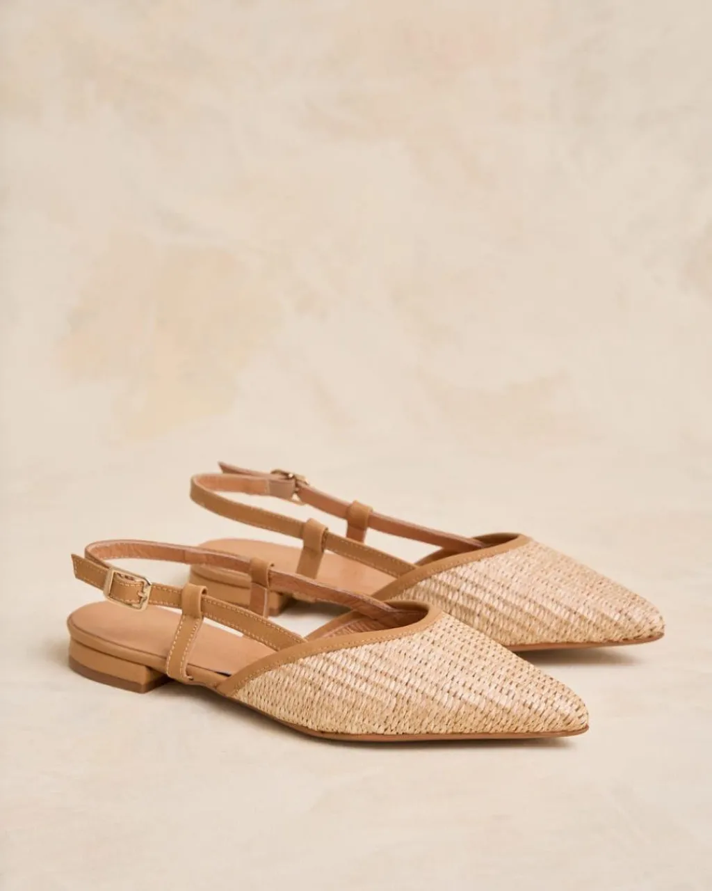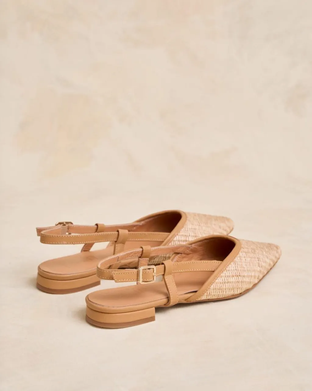 Bailarina con detalle de rafia, destalonada en color camel. Puntera puntiaguda. Escote redondeado. Correa con hebilla al talón. Es un calzado diferente y cómodo para combinarlo tanto con pantalones como con vestidos.