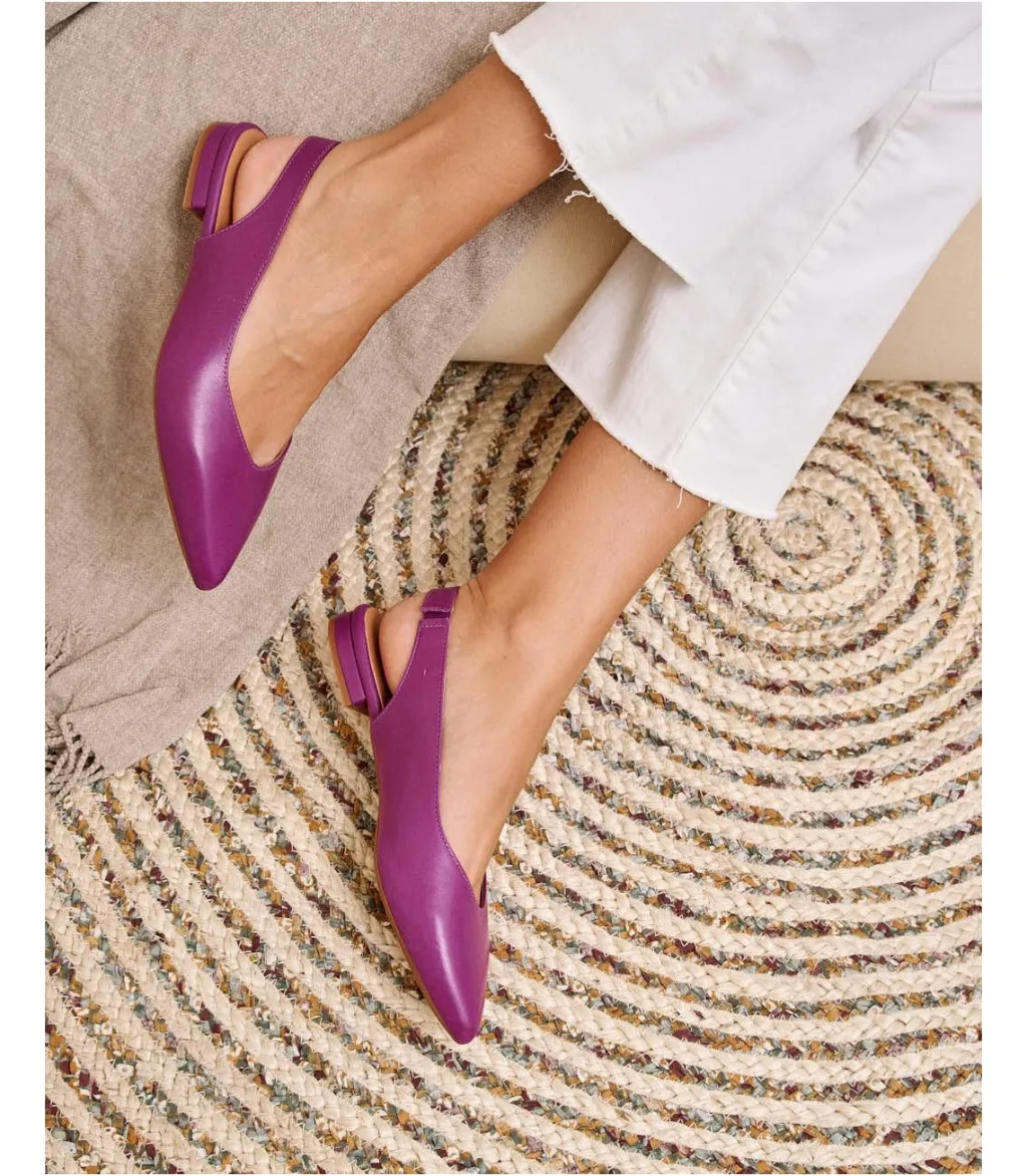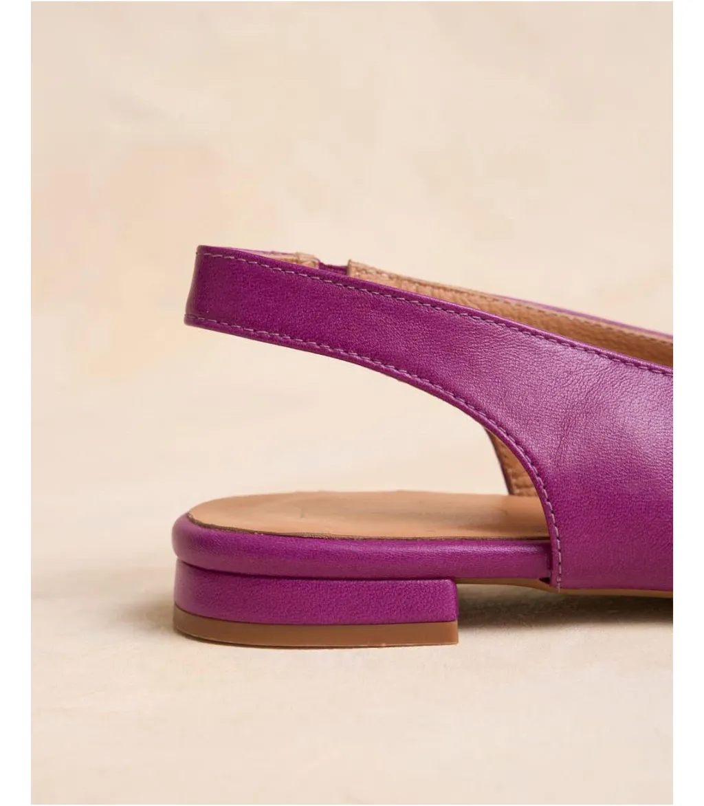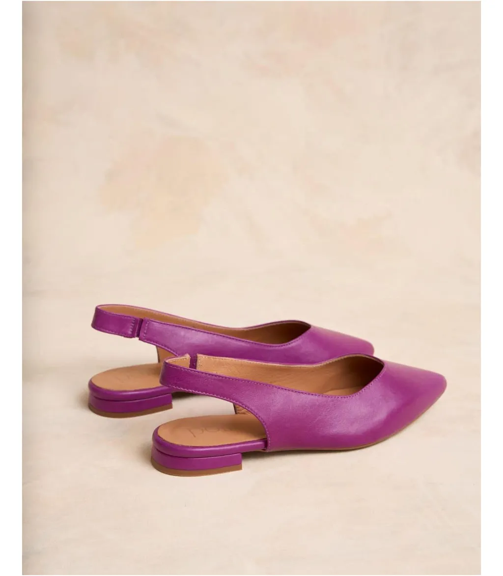 Bailarina de piel destalonada en color buganvilla. Puntera puntiaguda. Correa al talón. Es un calzado diferente y cómodo para combinarlo tanto con pantalones como con vestidos.