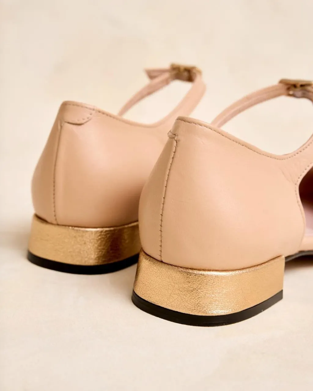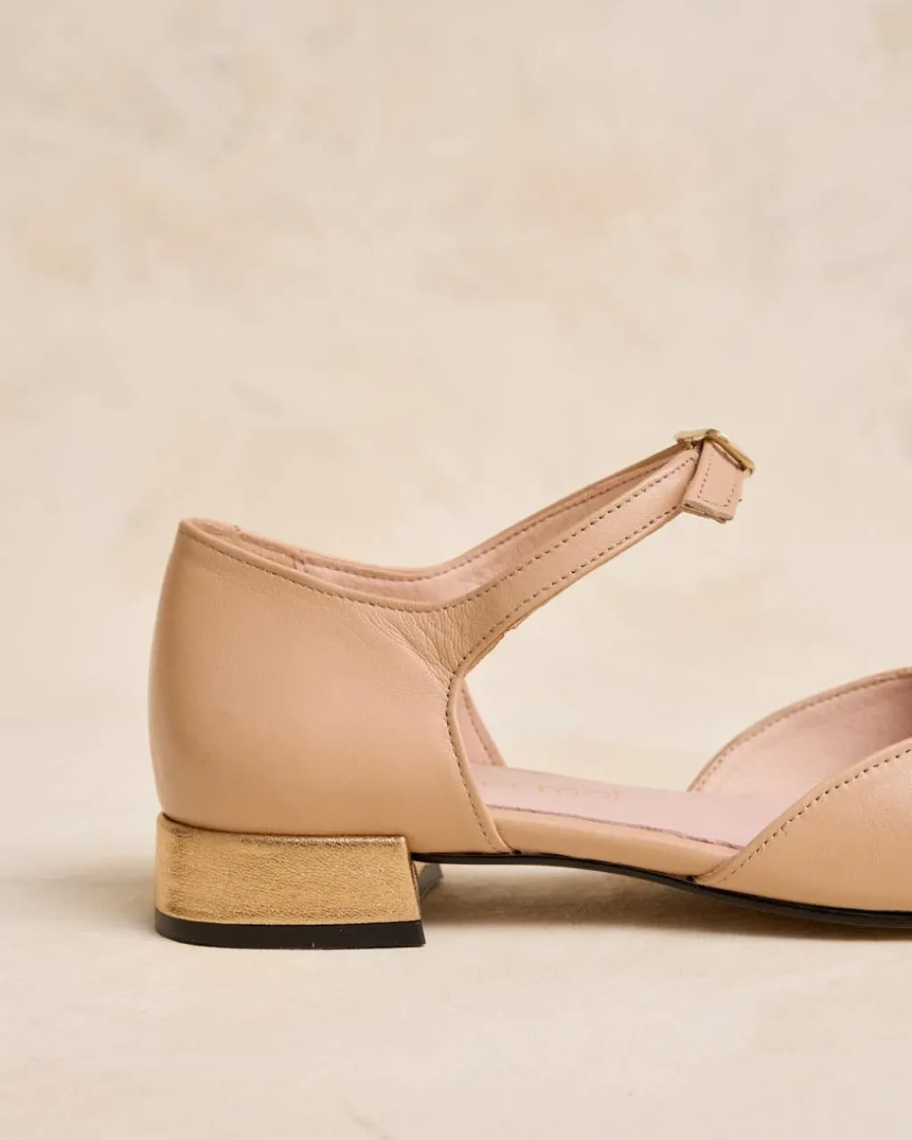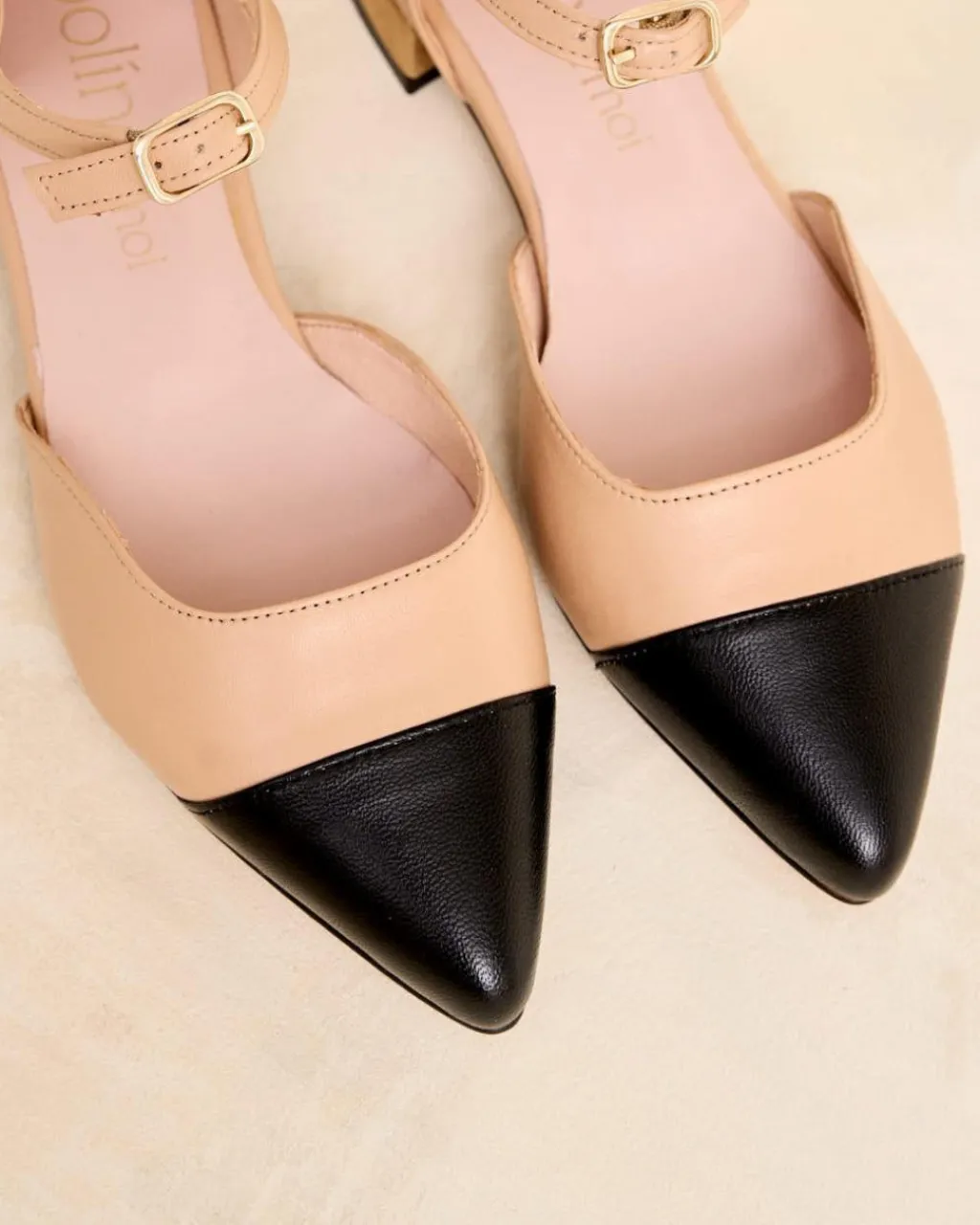 Bailarina de piel en color nude. Puntera puntiaguda en color negro. Correa con hebilla al tobillo. Pequeño detalle de tacón cuadrado en piel tono dorado. Es un calzado diferente y cómodo para combinarlo tanto con pantalones como con vestidos.