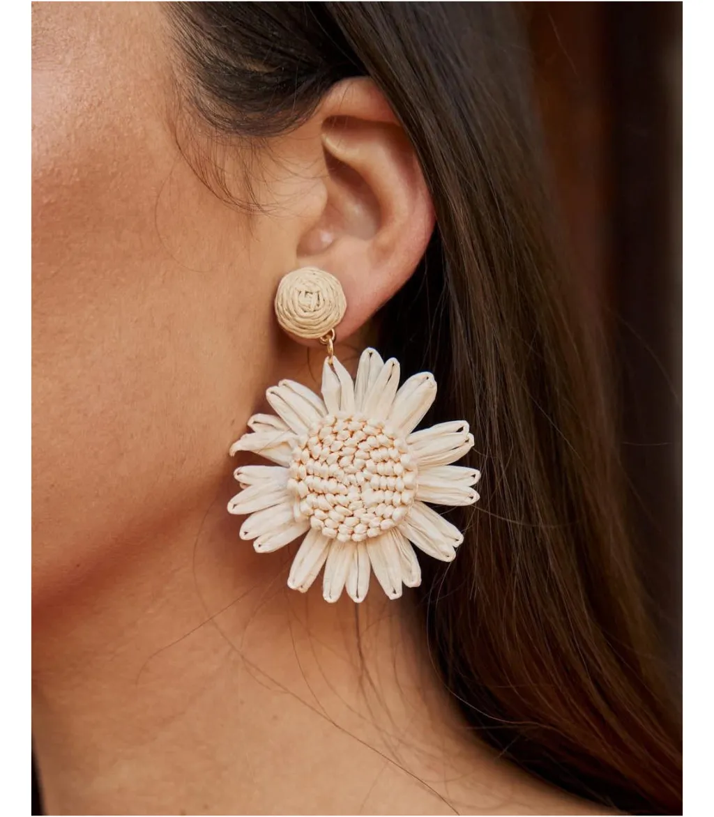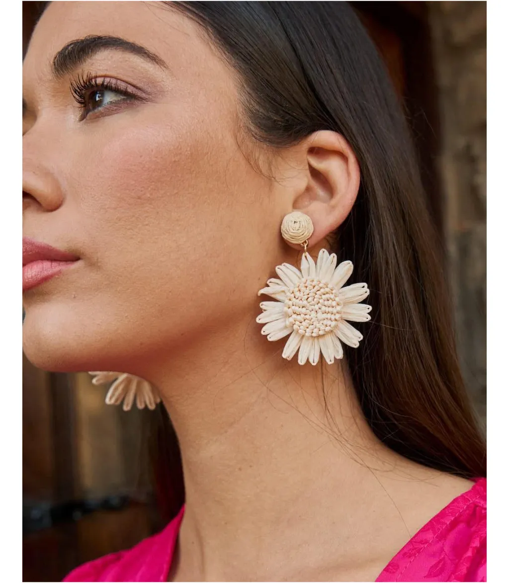 Pendientes largos de rafia con un sol grande colgando. Tono crudo. Pendientes muy ligeros. Cierre mediante tuerca. Un pendiente ideal para darle un toque original y divertido al look.