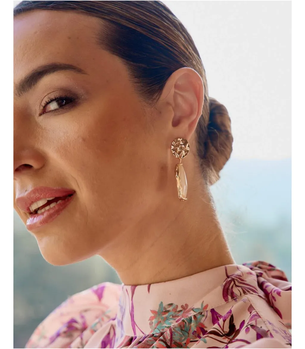 Pendientes en color dorado. Círculo en dorado del que cuelga una lágrima irregular en color nacarado claro. Un pendiente con movimiento. Cierre de tuerca. Ideal para darle un toque muy femenino a tu look de invitada.