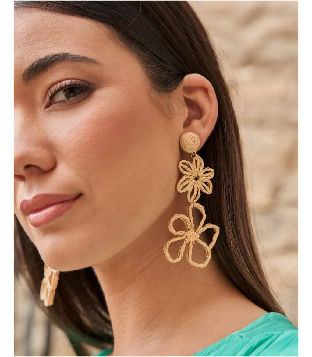 Pendientes largos con una flor en la parte que pega al lóbulo y otra flor más grande colgando. Pendientes con diseño alargado y muy ligeros. Cierre mediante tuerca. Un pendiente ideal para darle un toque diferente a tu look.