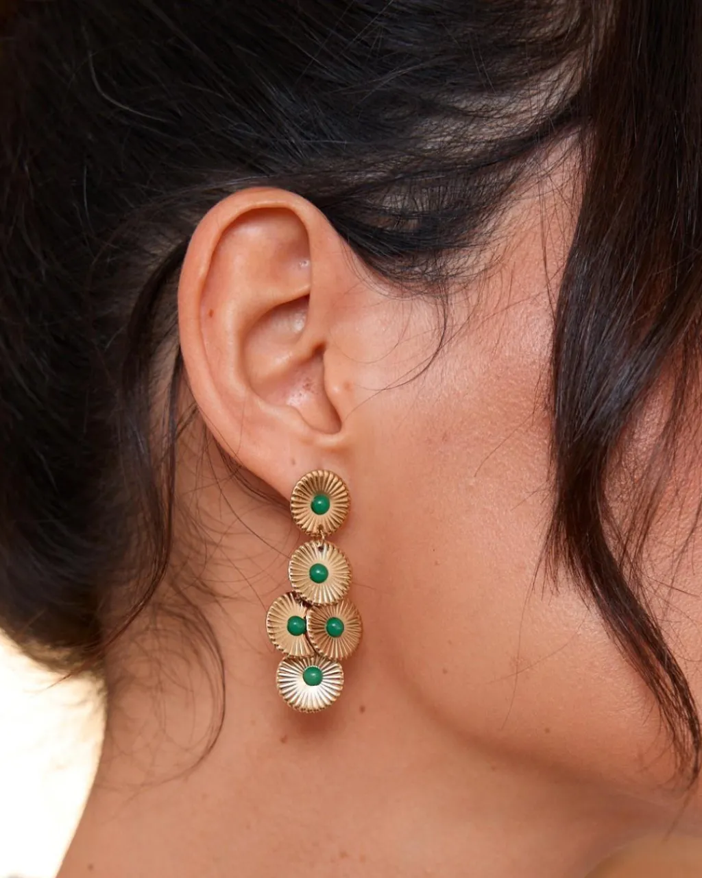 Pendientes largos de círculos con detalles de piedras verdes. Son muy ligeros. Cierre mediante tuerca. Un pendiente ideal para darle un toque diferente a tu look.