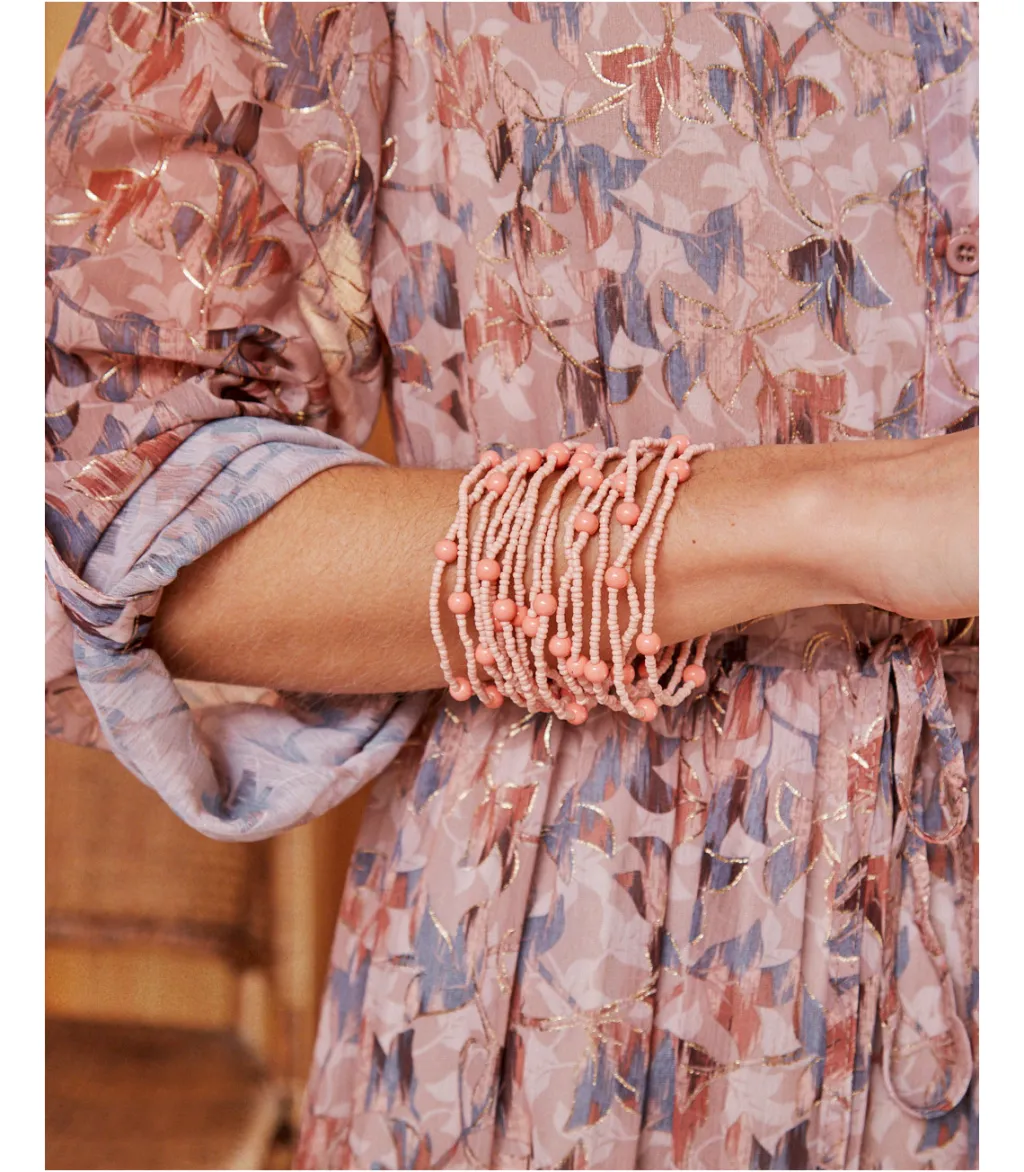 Múltiples pulseras elásticas formadas por pequeñas cuencas y abalorio en color rosa. Pulsera ideal para completar tus looks de temporada.
