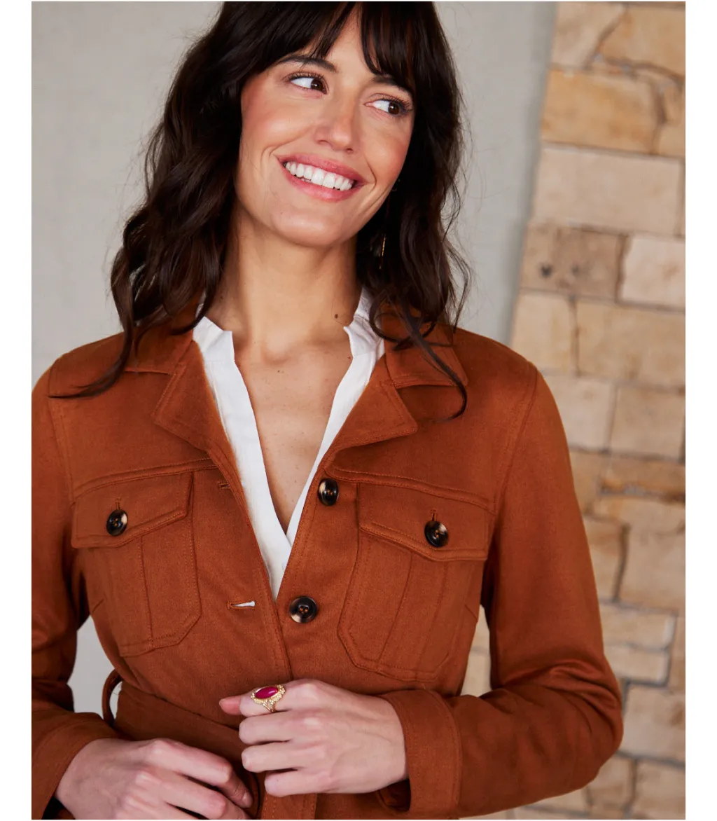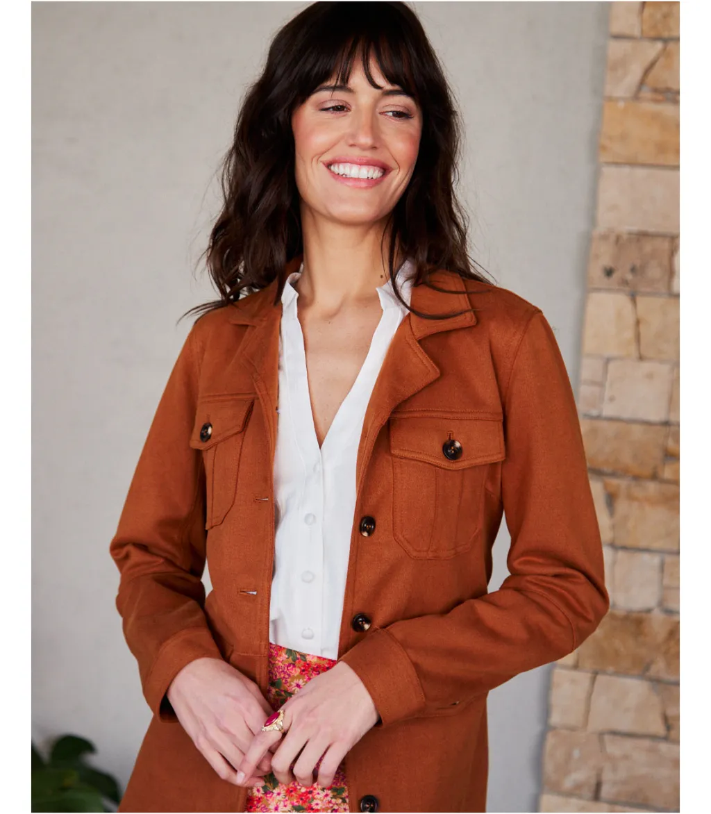 Cazadora sahariana en ante en color camel. Cuello en pico con solapas. Manga larga. Diseño de cuerpo recto. Hilera de botones desde el cuello hasta el bajo. Dos bolsillos con solapa sobre el pecho y otros dos en los laterales. Cinturón a juego en el mismo tejido. Un básico ideal para los días más fríos