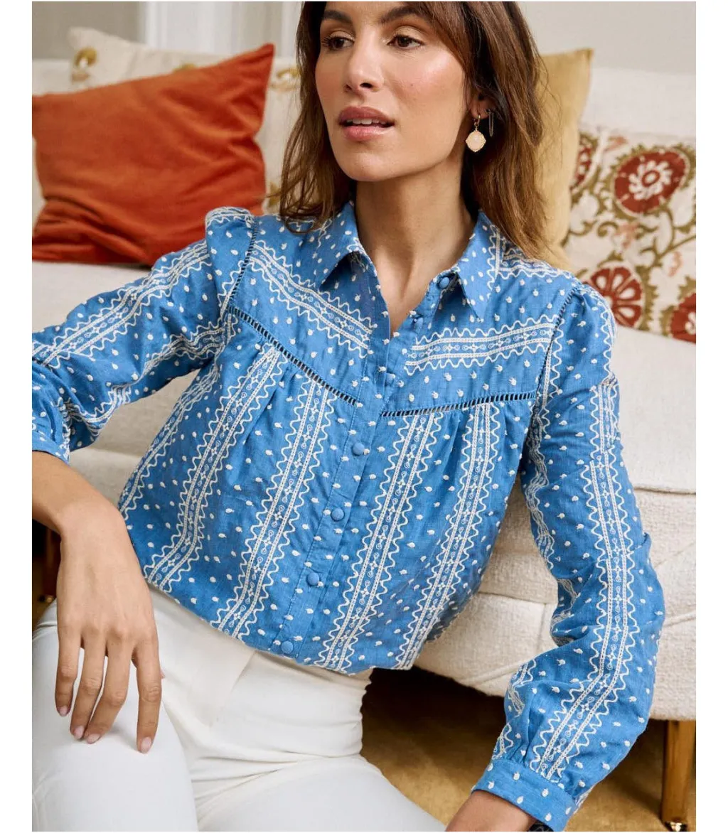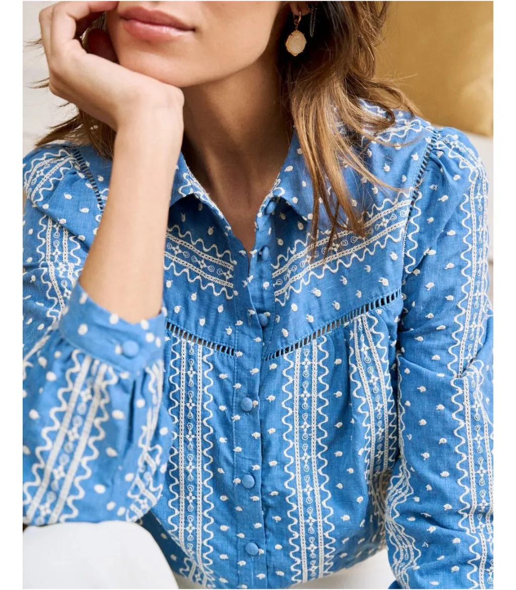 Blusa con estampado bordado en color crudo sobre un fondo azul marino. Cuello de camisa. Modelo de manga larga terminada en puño. Cuerpo recto y ligeramente holgado. Hilera de botones desde el cuello hasta el bajo. Camisa en un tejido vaquero con un toque elegante y alegre.