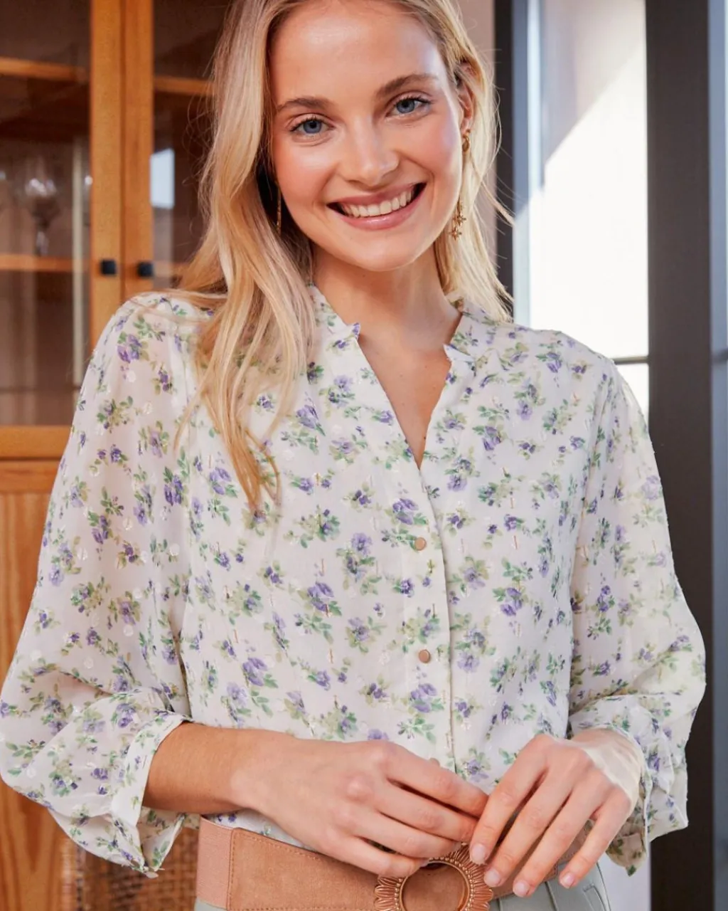 Camisa con estampado floral en color oliva con detalles de volantes. Cuello redondo, cerrado y ligeramente subido por un pequeño volante. Botonadura desde el cuello hasta el bajo. Modelo con volantes en el pecho y hombros. Manga larga terminada en puño. Cuerpo recto. Tejido ligeramente transparente.