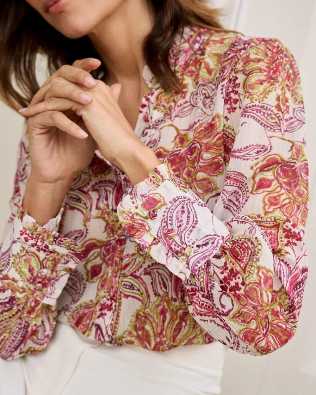 Blusa con estampado floral rosa sobre un fondo color crudo. Cuello redondo con ribete en hondas. Modelo de manga larga ligeramente abullonada y terminada en puño. Cuerpo recto. Hilera de pequeños botones desde el escote hasta el bajo. Ideal para aportar un toque romántico y sofisticado a tus looks.
