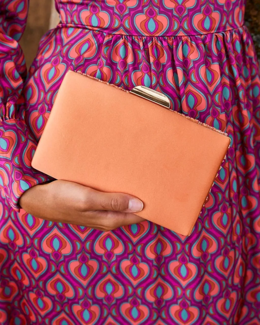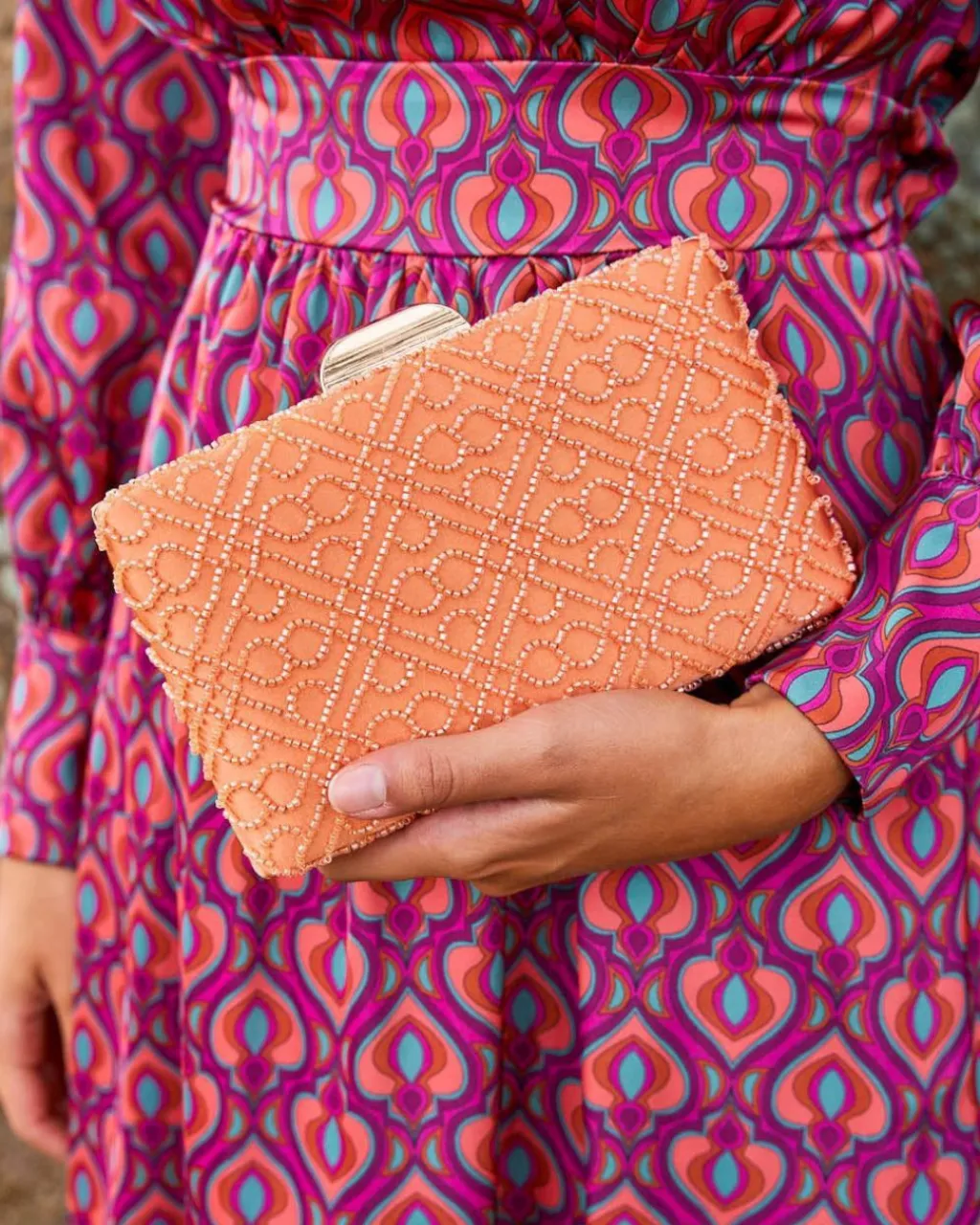 Clutch o bolso de mano en color salmón, con abalorios transparentes creando dibujos geométrico sobre un fondo satinado liso. Bolso con forma rectangular y puntas redondeadas con broche central metálico dorado que permite cerrar y abrir el bolso con facilidad
