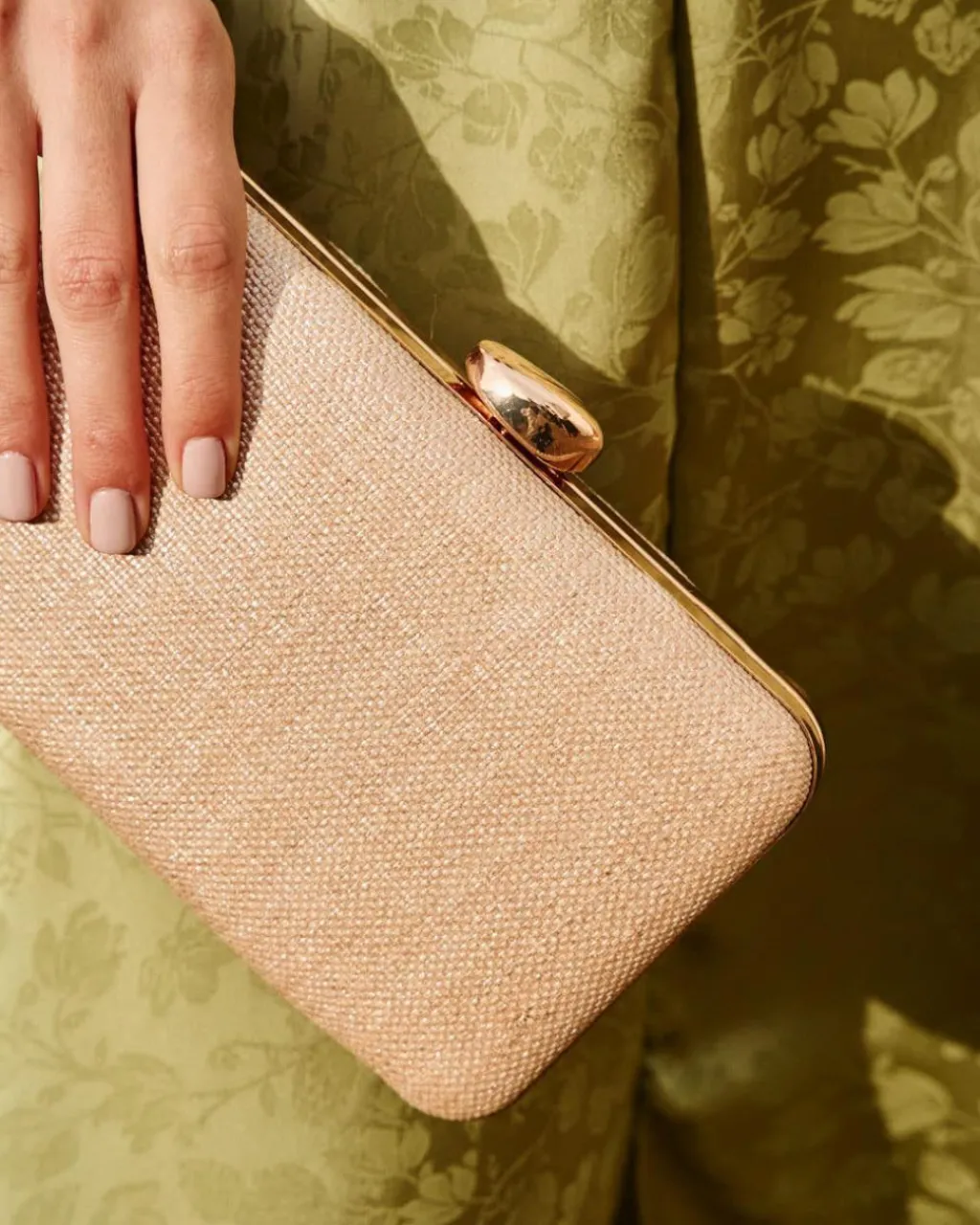 Clutch o bolso de mano en tono camel. Bolso con forma rectangular y puntas redondeadas con broche central metálico dorado que permite cerrar y abrir el bolso con facilidad.