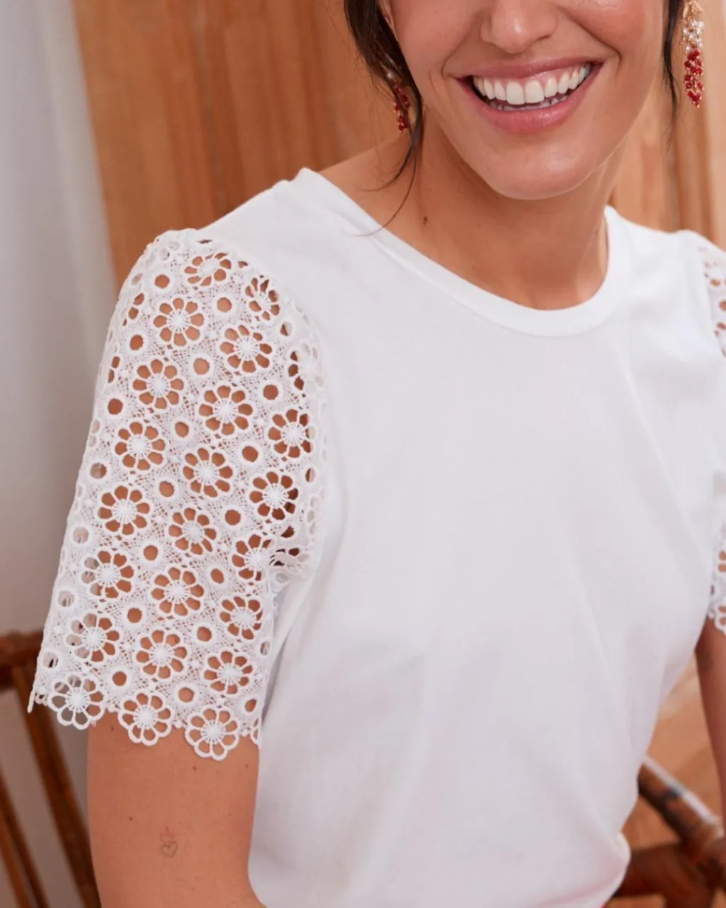 Camiseta blanca lisa. Detalle de mangas cortas en encaje floral, finalizando con un efecto pétalo. Escote redondo. Cuerpo recto. Camiseta para darle un toque diferente y combinar en el día a día. Ver másVer menos Referencia 180251 COMPOSICIÓN Y MEDIDAS:100% PoliésterBego mide 1,80 cm y lleva la talla S. Si dudas con la talla te recomendamos usar el recomendador online.CUIDADOS:Lavar a mano Ficha técnica Colores BLANCOS Etiquetas: EMM N5922 – ENVÍOS, CAMBIOS Y DEVOLUCIONES Favorito129 ENVÍOS:Todos los envíos cuentan con gastos de envío, que dependen de la dirección de entrega.• Península y Portugal: 3,50€ | 2-4 días laborables.• Baleares: 6,50€ | Hasta 7 días laborables.• Países de la Unión Europea: 10,95€ | Hasta 10 días laborables.• Envíos a Europa (No UE): 15,95€ | Hasta 10 días laborables.• Resto del mundo*: Aprox 10€ | Hasta 15 días laborables.*NO hacemos envíos a Canarias, Ceuta, Melilla, Afganistán, Bielorusia, Congo, Bali, Myanmar, Nigeria, Rusia, Senegal, Somalia y Ucrania.¡Importante! En periodo de rebajas, los pedidos pueden tardar un poco más de lo habitual ¡Rogamos paciencia!CAMBIOS: ¡El envío con el cambio solicitado es gratuito!Pedidos realizados desde España:Plazo de 14 días laborables desde que recibes el paquete en casa.Pedidos realizados desde fuera de España:Plazo de 20 días naturales desde que realizamos el envío.*La gestión del envío del paquete de vuelta a nuestro almacén corre a cuenta del cliente, haciéndose cargo de los costes de este envío, mediante el courier de su elección o con nuestro servicio de DHL.En el primer trámite de cambio, el envío de vuelta es gratuito (tanto de talla como de producto). Permitimos DOS trámites de cambio, en caso de querer tramitar un segundo cambio, se descontarán los gastos de envío según destino.Una vez recibido el paquete en nuestro almacén, tramitaremos tu cambio en un plazo máximo de hasta 10 días laborables. Recibirás un correo de confirmación cuando este pedido de cambio esté listo para ser enviado.