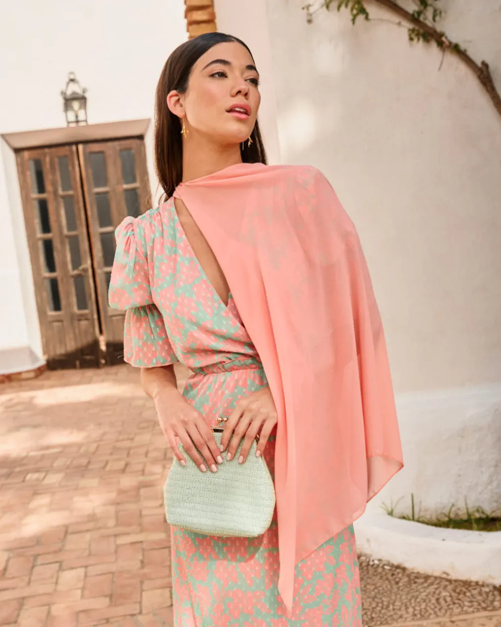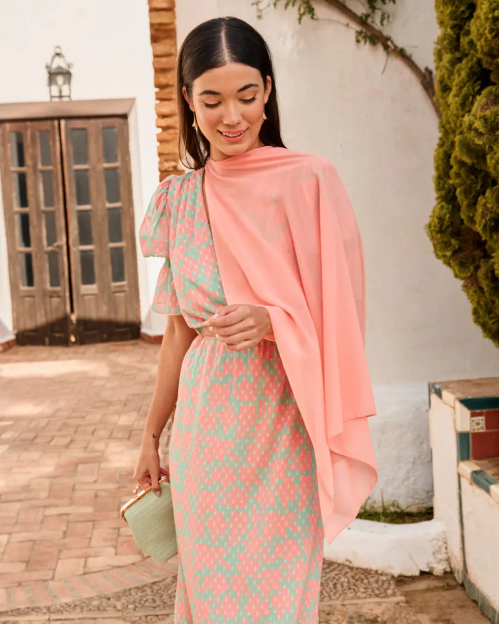 Capa lisa multiposición en color melocotón, unida. Ideal para acompañarte en todos tus planes o eventos y fácil de combinar con cualquier look. Fular agradable al tacto.