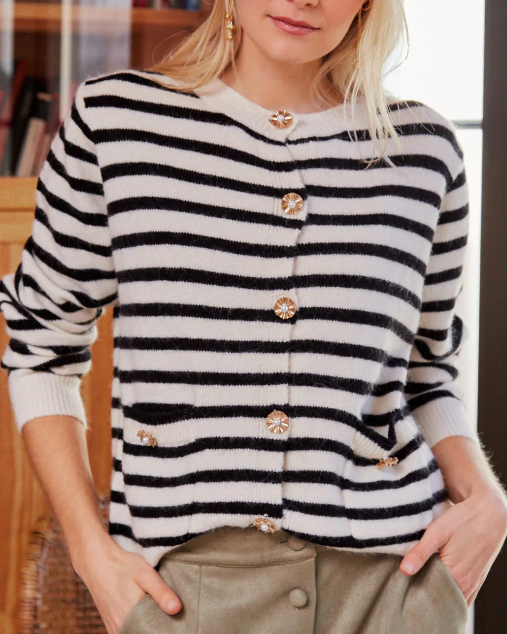 Cárdigan de punto a rayas en color crudo y azul marino. Cuello redondo. Manga larga terminada en puño. Dos bolsillos delanteros. Hilera de botones joya en dorado desde el cuello hasta el bajo. Diseño de cuerpo recto. Una prenda perfecta para dar luz y estilo a tu armario.