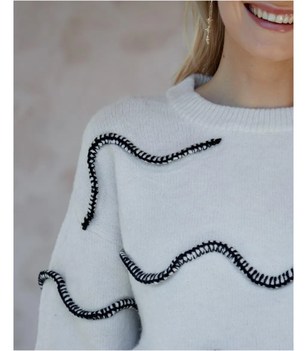 Jersey de punto en color blanco con pespuntes en forma de ondas en azul marino. Cuello redondo. Manga larga, de hombro caido y terminada en puño. Diseño de cuerpo recto.