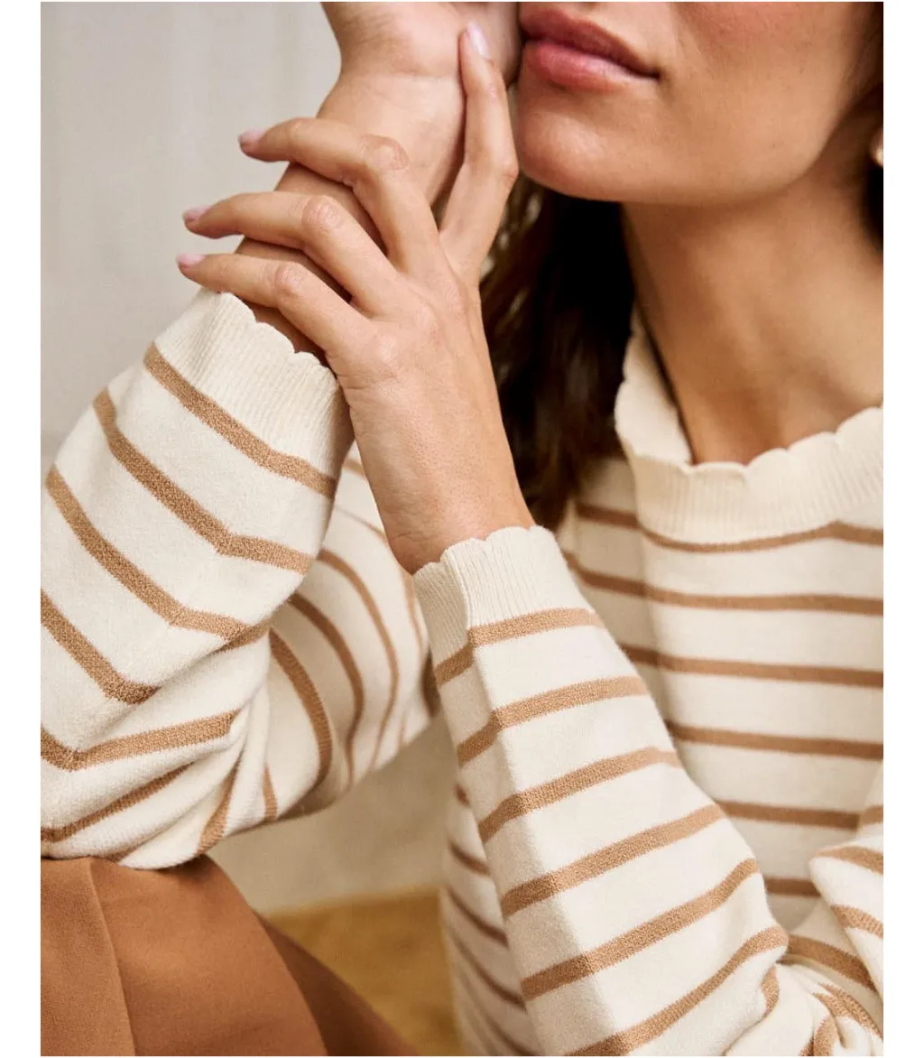 Jersey de punto en color beige con rayas marineras. Cuello redondo con detalles de botones dorados sobre el hombro y manga larga recta. Diseño de cuerpo recto.
