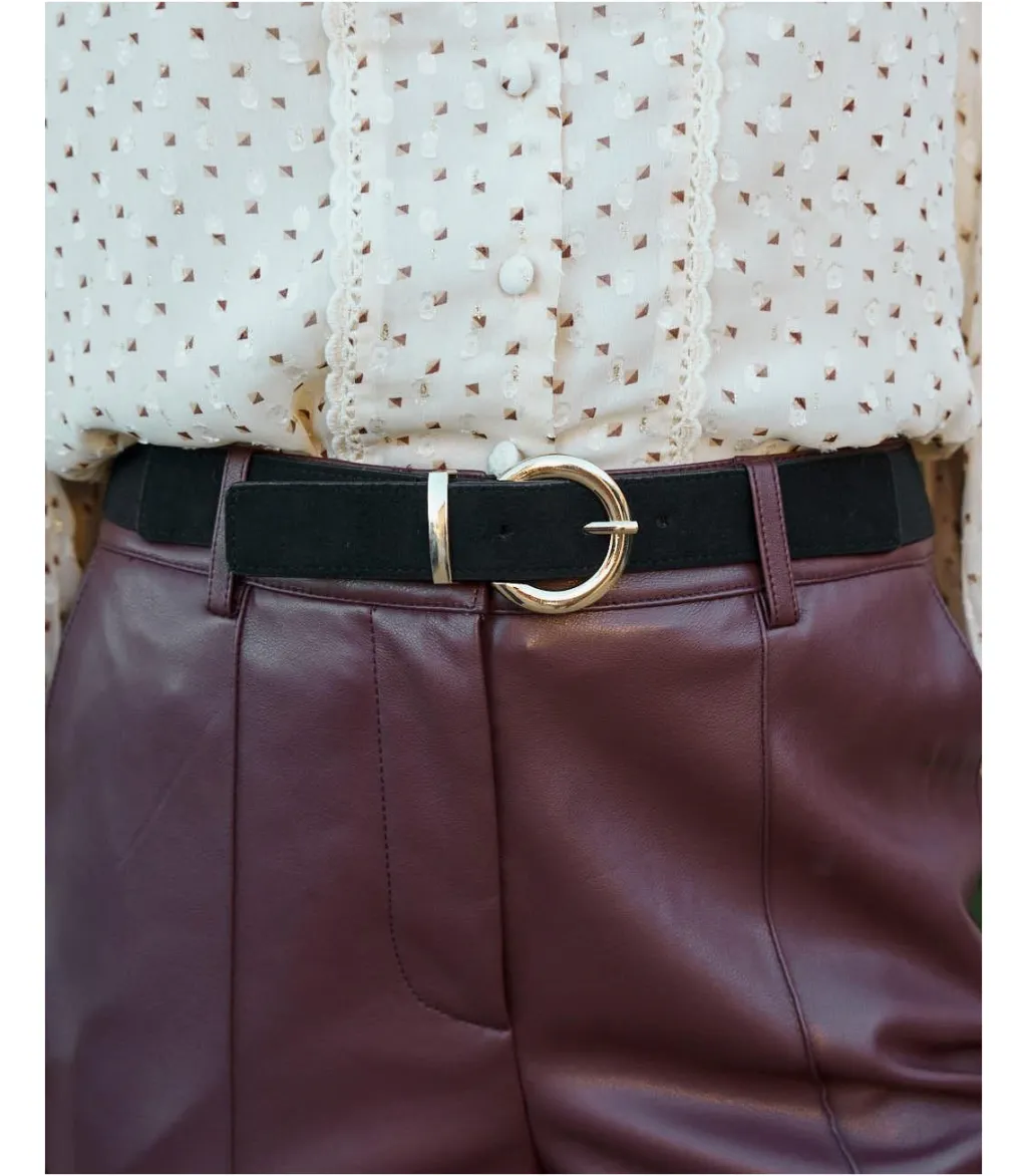 Cinturón en color negro con detalle de hebilla en dorado. Material de ante delantero. Diseño elástico para ajustar cómodamente. Cierre mediante hebilla central. Ideal para combinar con y jeans favoritos de esta temporada.