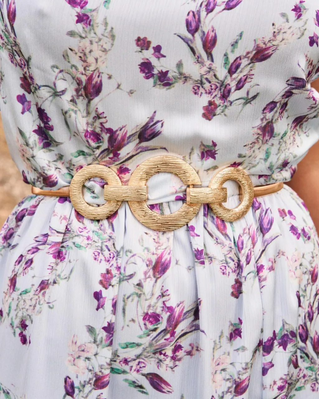 Cinturón fino elástico con círculos de diferentes tamaños en línea, en el centro. Tono dorado. Cierre en la parte delantera. Accesorio ideal para completar tus looks.