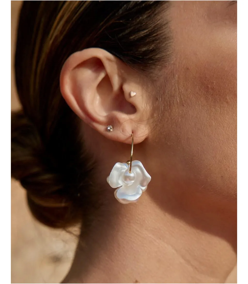 Pendientes largos que caen con una flor en relieve en tono perla. Modelo con cierre en la parte trasera de clic. Unos pendientes ligeros e ideales con los que dar un toque sofisticado a tus looks.