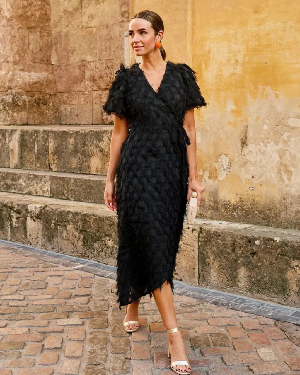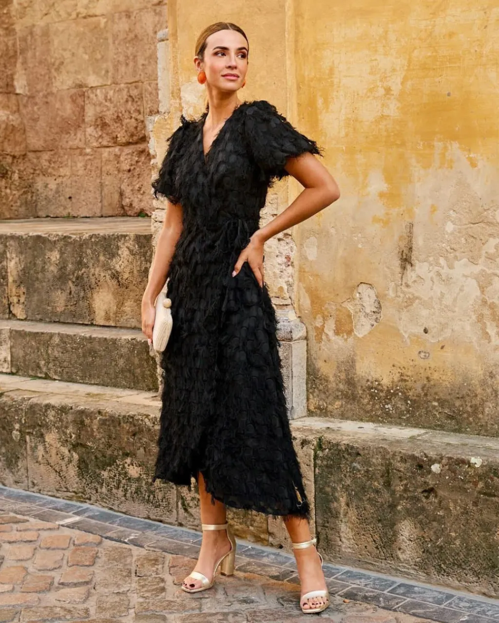 Vestido midi cruzado con relieves de círculos y flecos en color negro. Escote cruzado en pico. Manga corta ligeramente abullonada terminada en elástico. Cintura ligeramente más estrecha gracias a una cinta con el mismo estampado a modo cinturón que se adapta al cuerpo. Falda con volante para un mayor vuelo. Incluye forro interior. Un vestido con un tejido con flecos muy especial. Es perfecto para combinarlo con complementos con colores vivos. Vestido también ideal para el embarazo y lactancia.
