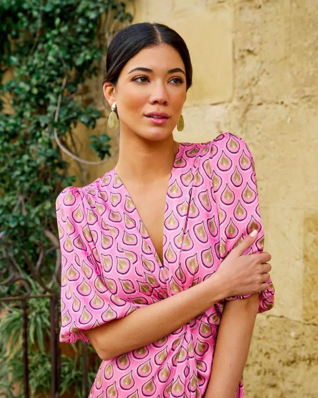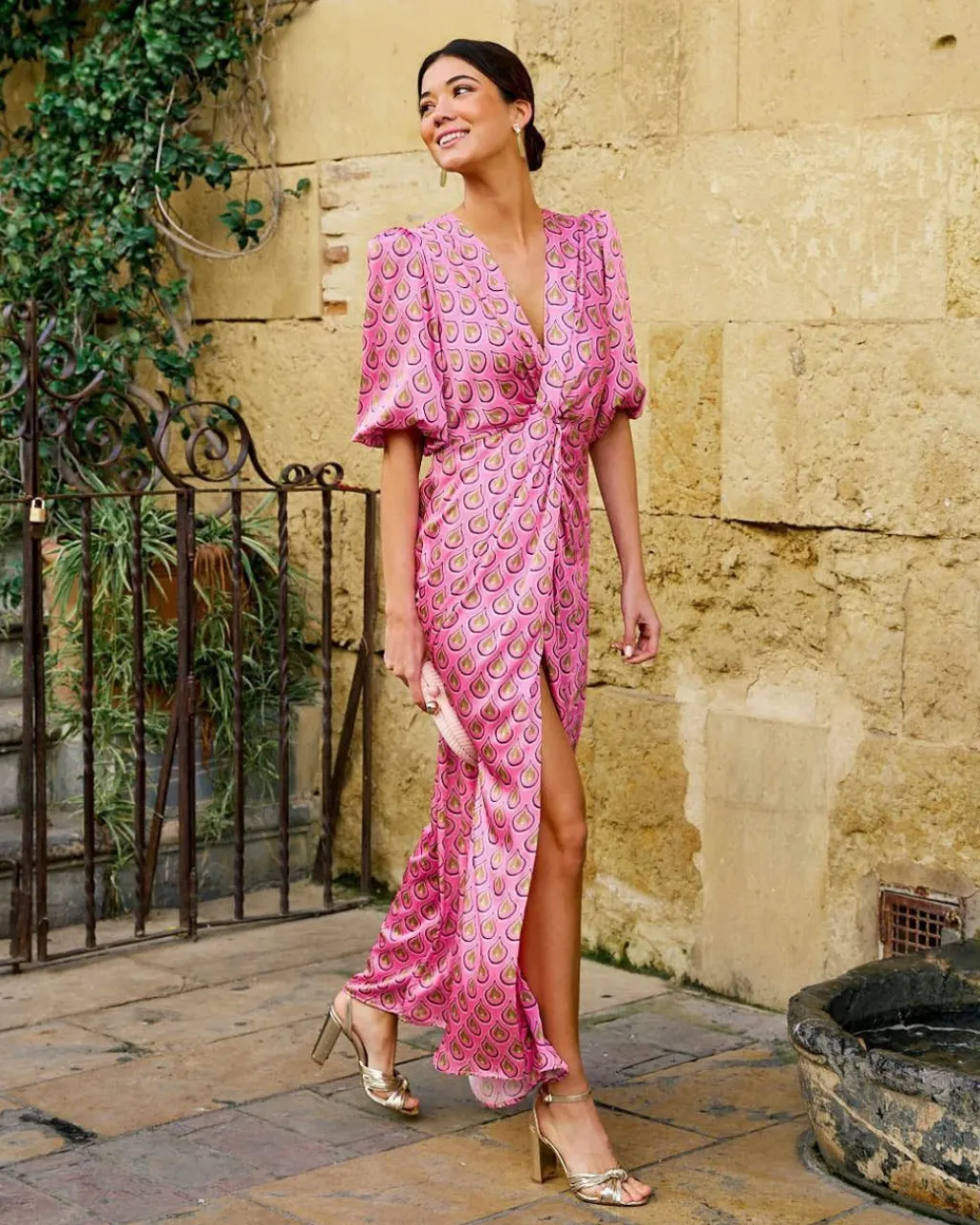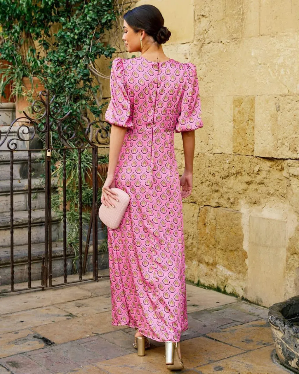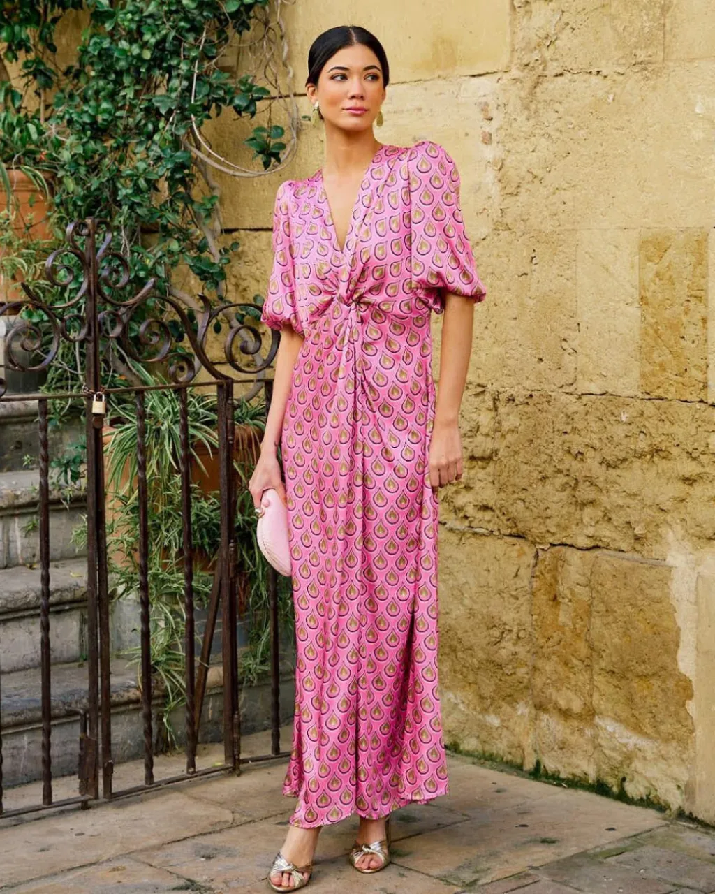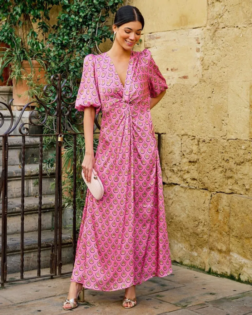 Vestido largo con estampado de lágrimas en color rosa. Escote en pico. Corte en la cintura. Detalle de fruncido debajo del pecho que baja hasta la falda. Manga corta y ligeramente abullonada terminada en elástico. Cierre de cremallera en la espalda. Flada con vuelo y con corte central. Tejido muy cómod y suave. Incluye forro interior. Vestido muy femenino y estiloso para deslumbrar en los eventos de la temporada.