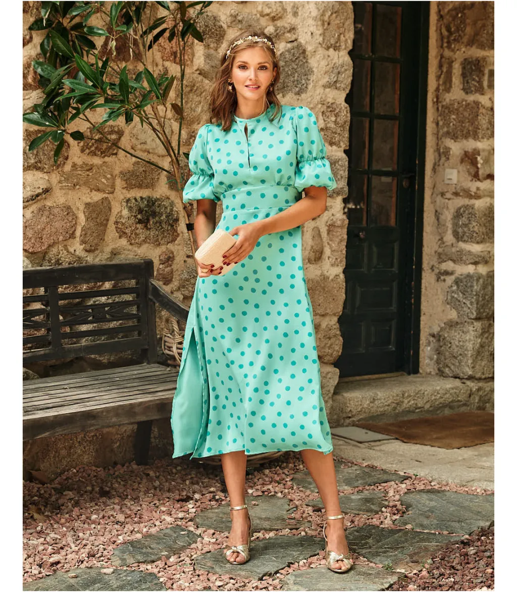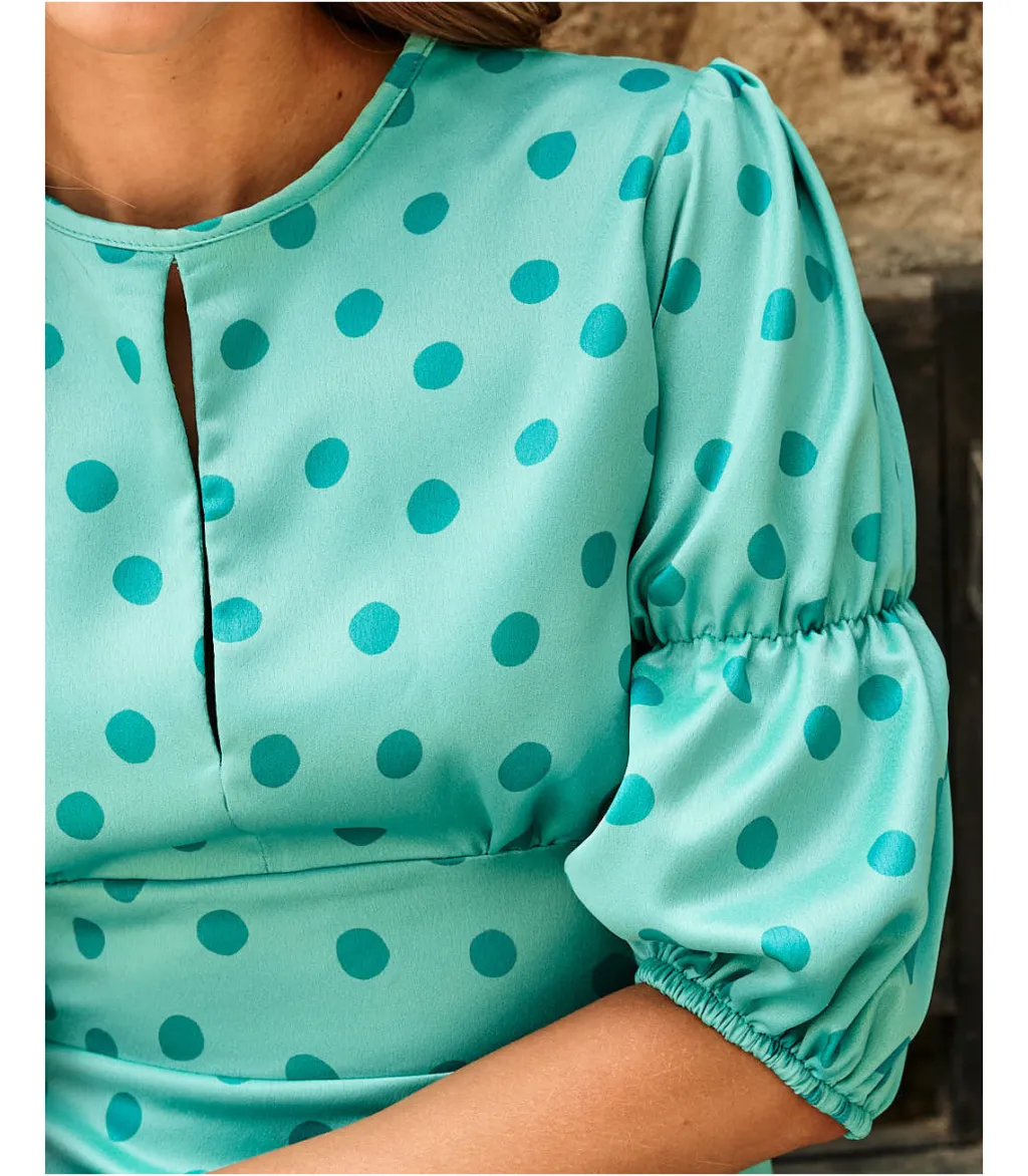 Vestido largo con estampado de lunares en color turquesa. Cuello redondo cerrado con una pequeña abertura en el escote. Cintura ligeramente más ajustada con una franja y elástico trasero. Manga ¾ con detalle de doble elástico. Falda recta con vuelo. Un vestido muy original y divertido. Es ideal para combinarlo con tus complementos favoritos.