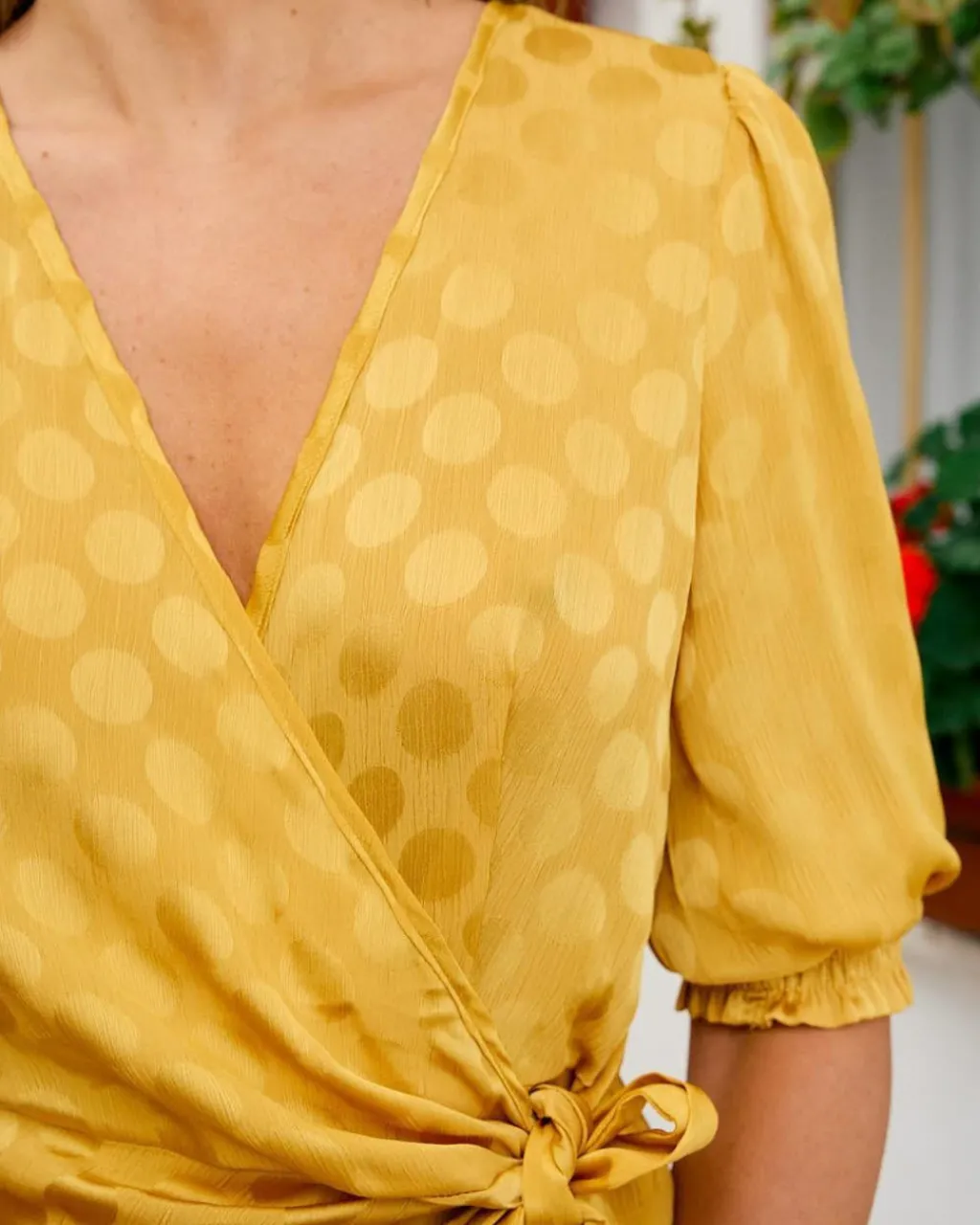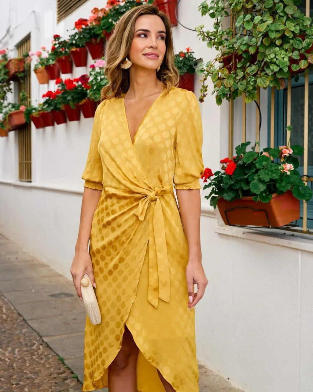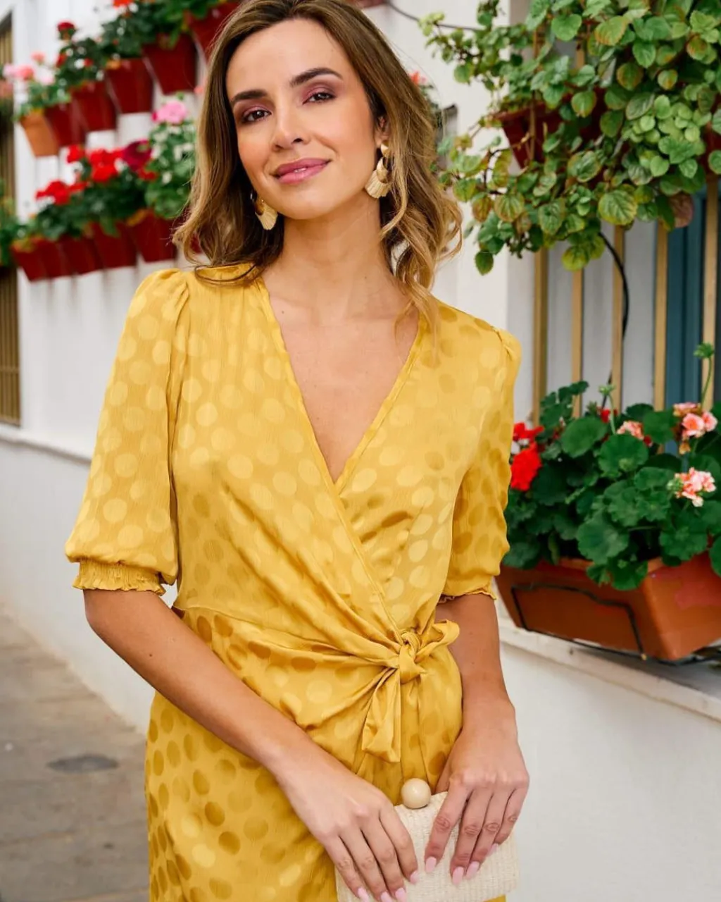 Vestido midi con color mostaza. Escote pico cruzado. Corte en la cintura. Cintas en el mismo estampado del vestido que se atan a modo lazo en el lado izquiero de la cintura. Manga corta y ligeramente abullonada terminada en elástico. Falda cruzada. Un vestido muy favorecedor y versátil con un color que te aportará luz y calidez esta temporada. Vestido también ideal para el embarazo y lactancia.
