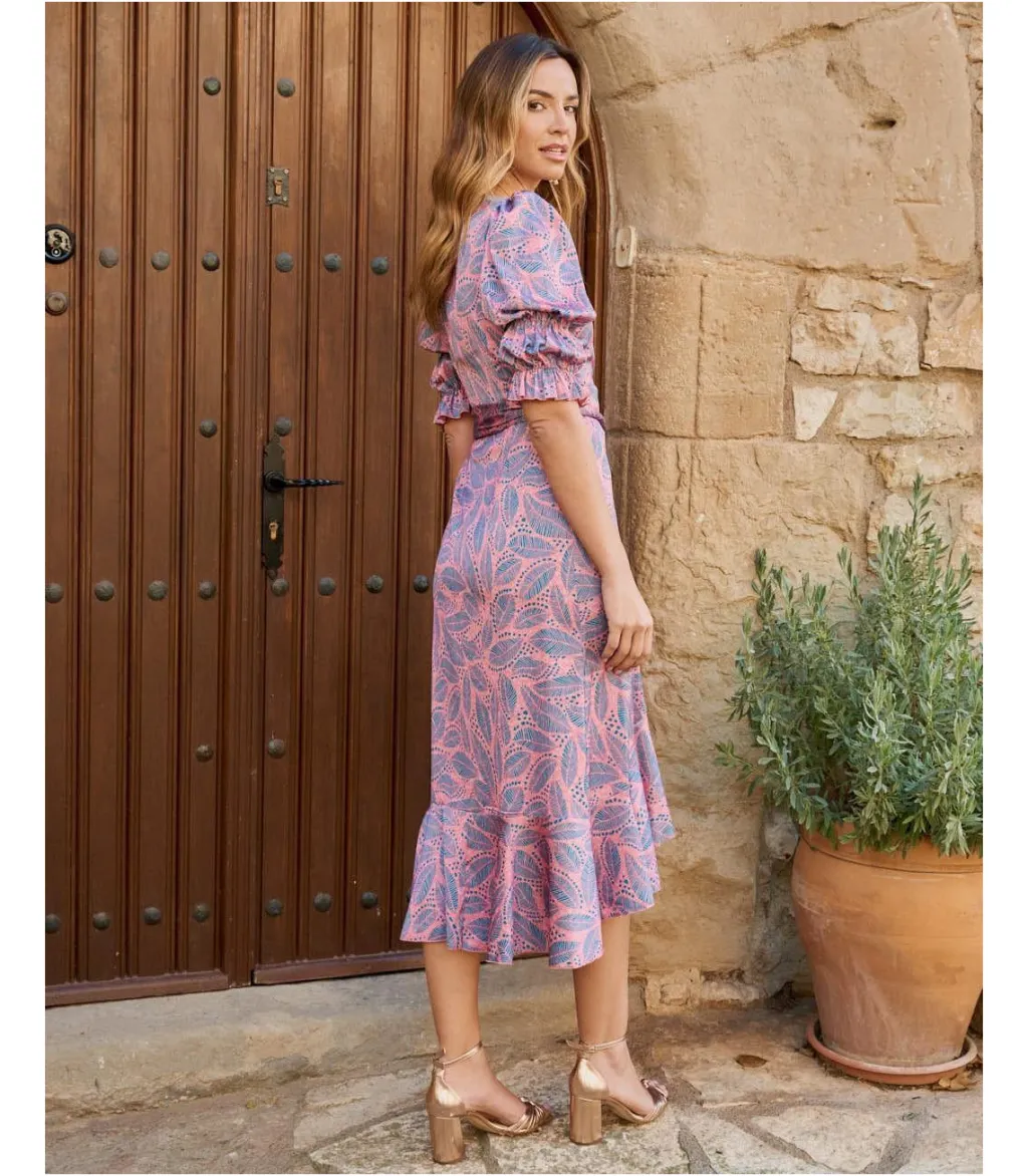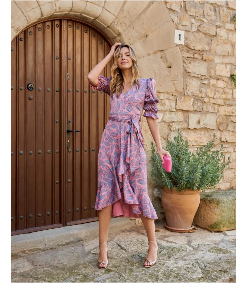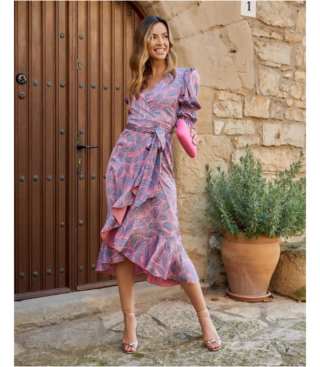 Vestido midi con estampado de plumas. Escote en pico y con la cintura ligeramente más ajustada con goma trasera para una mayor adaptación al cuerpo. Manga francesa con elástico y volante al final. Bajo del vestido con un gran volante. Incluye forro interior. Un vestido ideal para las invitadas con un toque de color muy especial.Vestido de invitada con un coste de devolución especial de 3,95€ que será descontado del importe total a devolver.