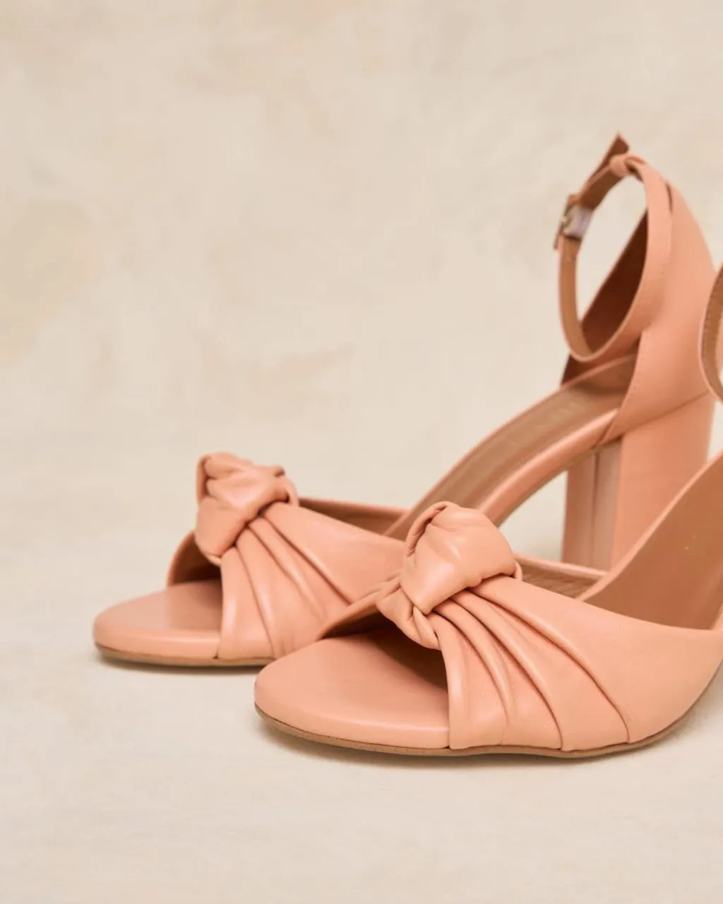 Sandalia de tacón en color melocotón. Punta redondeada. Escote con detalle de nudo en el centro. Cierre al tobillo mediante correa regulable con hebilla cuadrada. Un zapato elegante y cómodo.