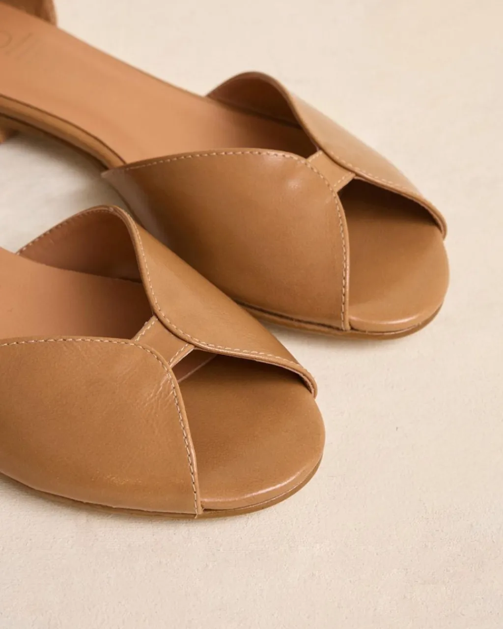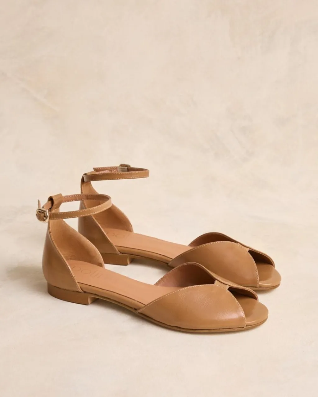 Sandalia de piel plana en color cuero. Puntera ligeramente redondeada y escote mariposa. Cierre al tobillo con tira en tono y hebilla para ajustar la sandalia al tobillo. Una sandalia elegante y cómoda.