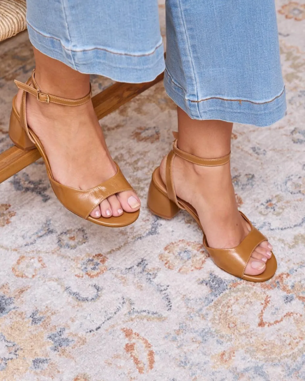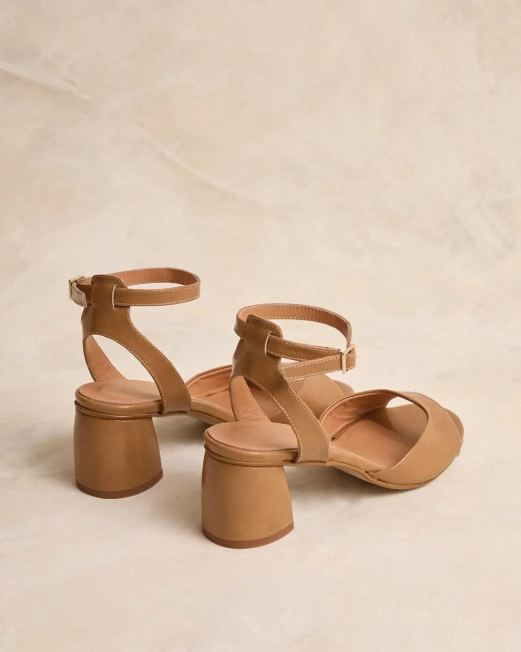 Sandalia de piel con tacón en tono cuero. Puntera abierta ligeramente redonda. Escote redondeado. Tacón cuadrado. Cierre al tobillo con tiras en tono y hebillas para ajustar la sandalia al tobillo. Una sandalia elegante y cómoda.