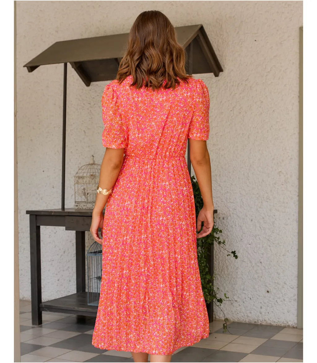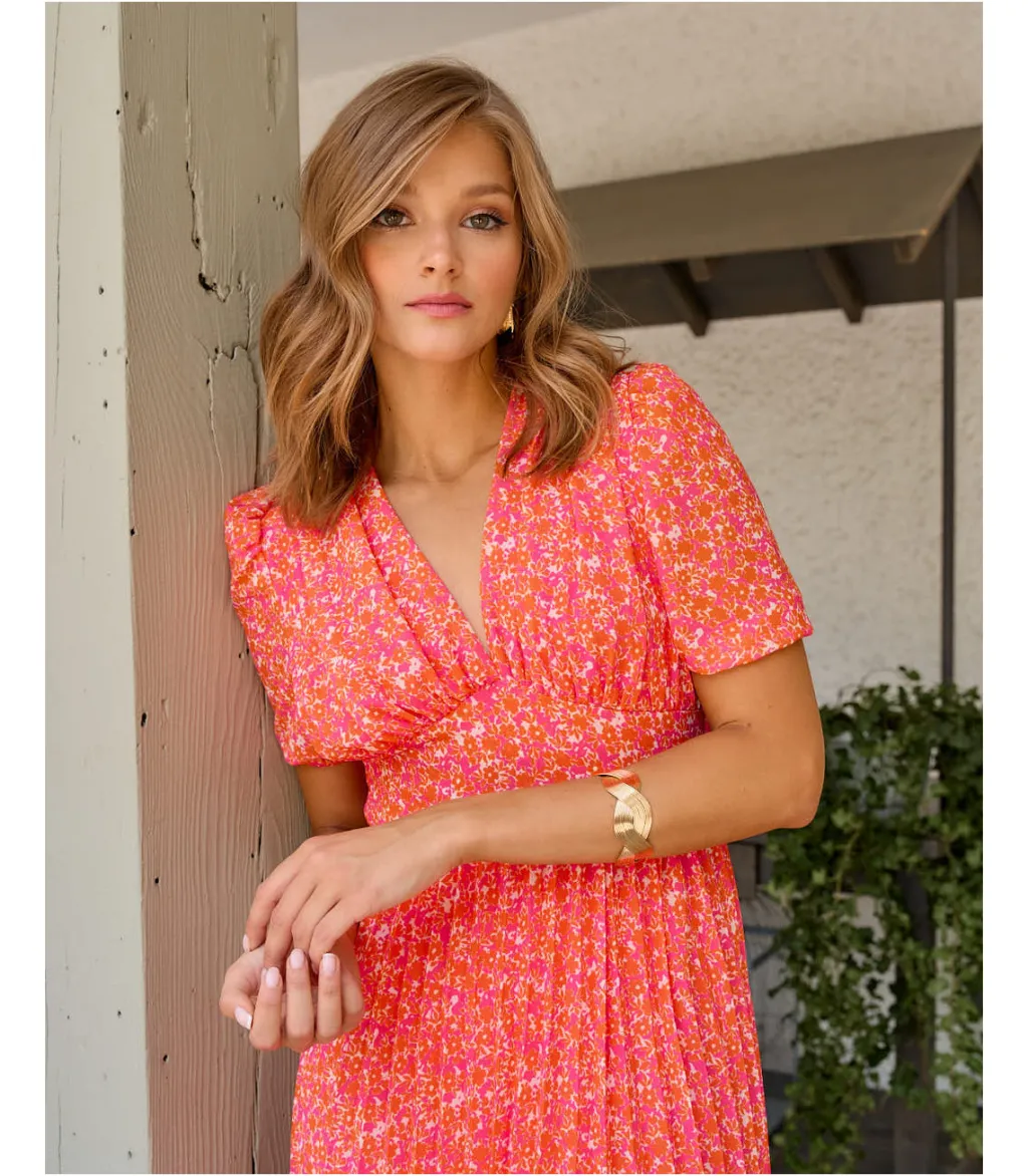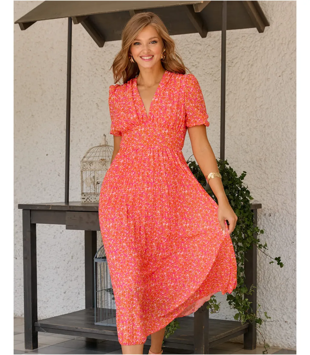 Vestido largo con estampado floral en color naranja. Escote en pico con corte bajo el pecho. Ligeramente ajustado a la cintura mediante elástico a la espalda. Diseño de manga corta ancha y elástico. Falda plisada. Dispone de forro interior. Tela ligera y vaporosa. Diseño ideal para la lactancia.