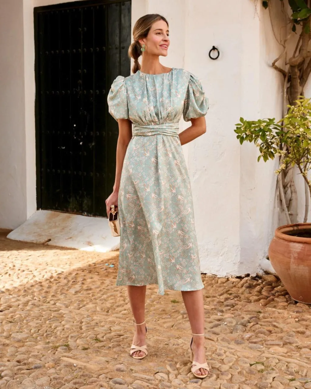 Vestido con estampado floral, sobre fondo en tono verde agua. Escote redondo, con cinta trasera para cerrar el vestido. Cintura ligeramente más ajustada con goma para una mayor adaptación al cuerpo. Apertura en la espalda. Manga corta abullonada. Bajo del vestido fluido. Un vestido ideal para las invitadas con un toque de color muy especial.