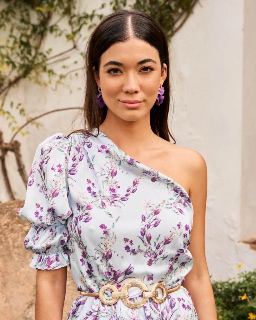 Vestido con estampado floral sobre fondo celeste. Escote asimétrico, con una sola manga abullonada, con dos elásticos. Cintura ligeramente más ajustada con goma para una mayor adaptación al cuerpo. Falda del vestido fluida, con apertura desde la rodilla. Un vestido ideal para las invitadas con un toque de color muy especial. Vestido también perfecto para el embarazo.