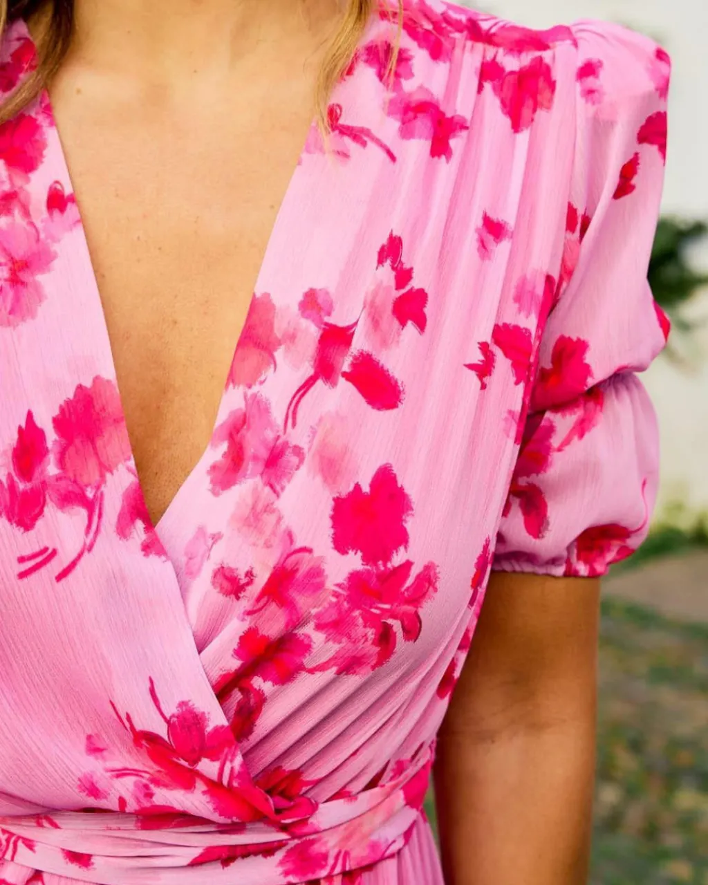 Vestido largo con estampado floral en color frambuesa. Escote en pico cruzado. Corte en la cintura con detalle de cinta para atar a modo de cinturón en el mismo estampado del vestido. Manga corta abullonada con detalle de elástico y terminada en volante. Falda con diseño recto con volante en el bajo con algo de vuelo. Incluye forro interior. Vestido estiloso y fabuloso para lucir en tus eventos favoritos. Vestido también ideal para el embarazo y lactancia.