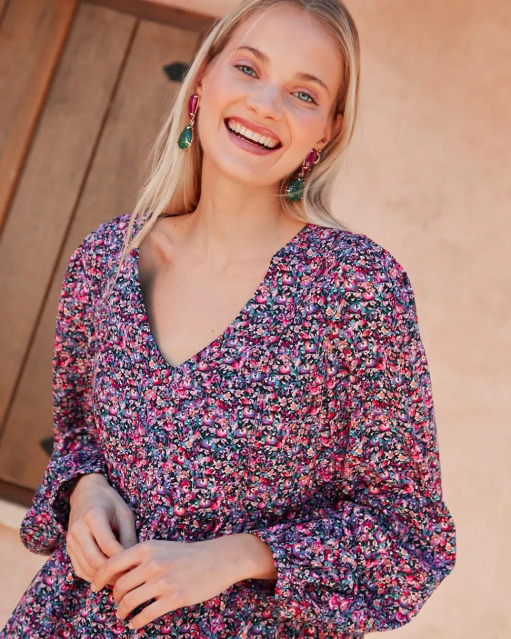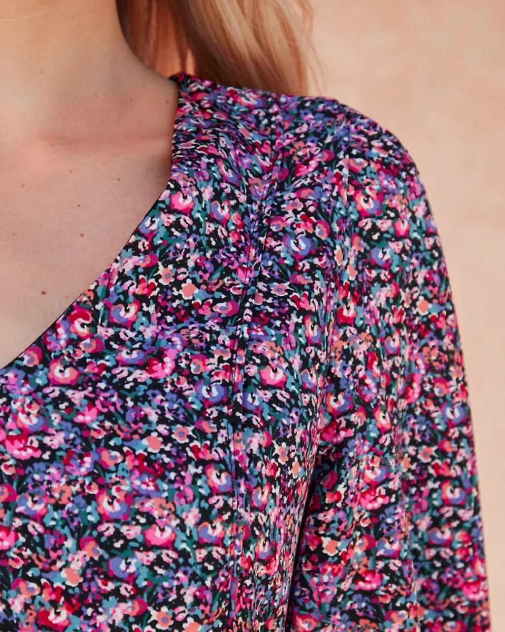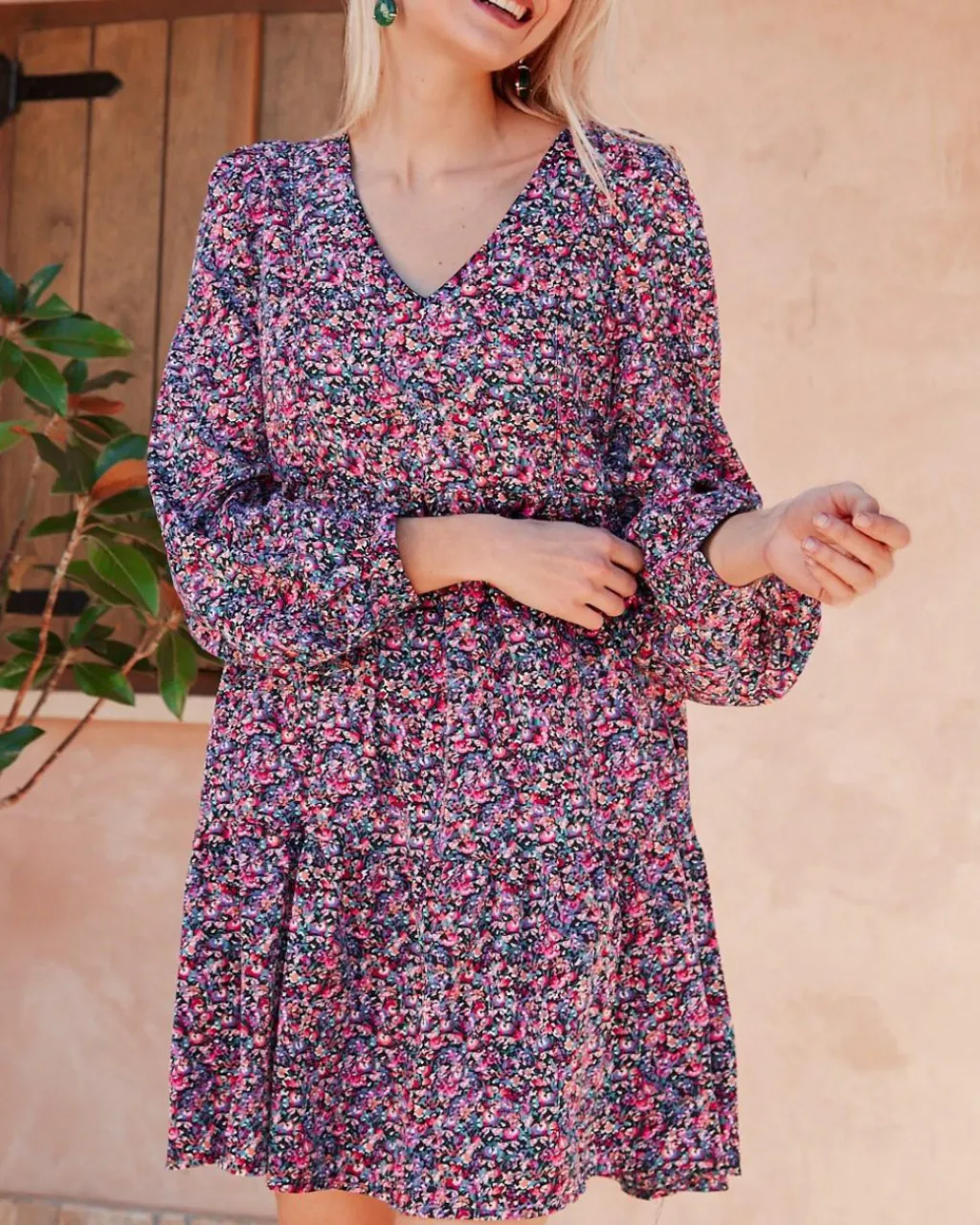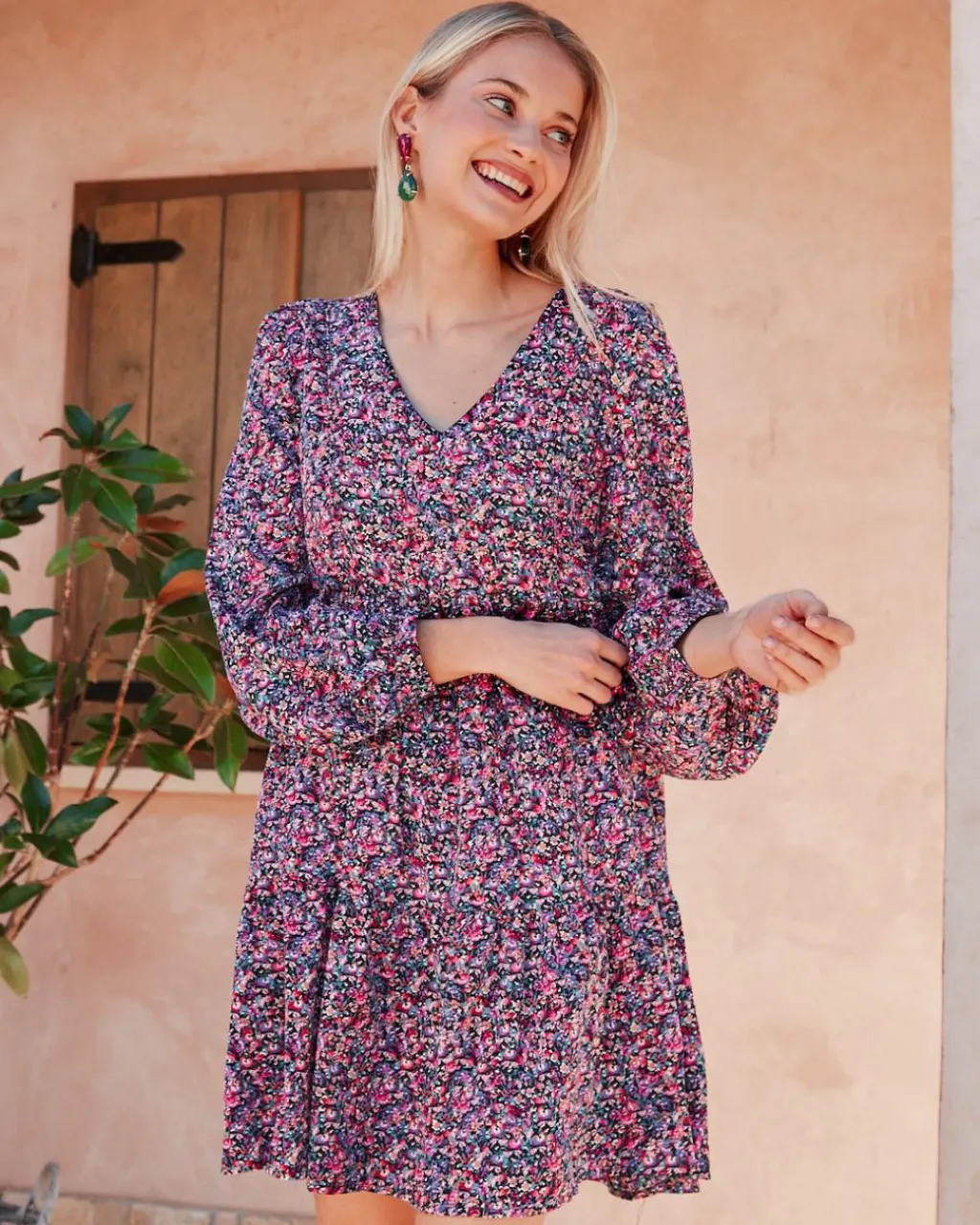 Vestido con corte babydoll corto con estampado floral en color morado. Cuello camisa. Modelo de manga larga terminado en puño. Dispone de forro interior. Falda corta y con volumen.