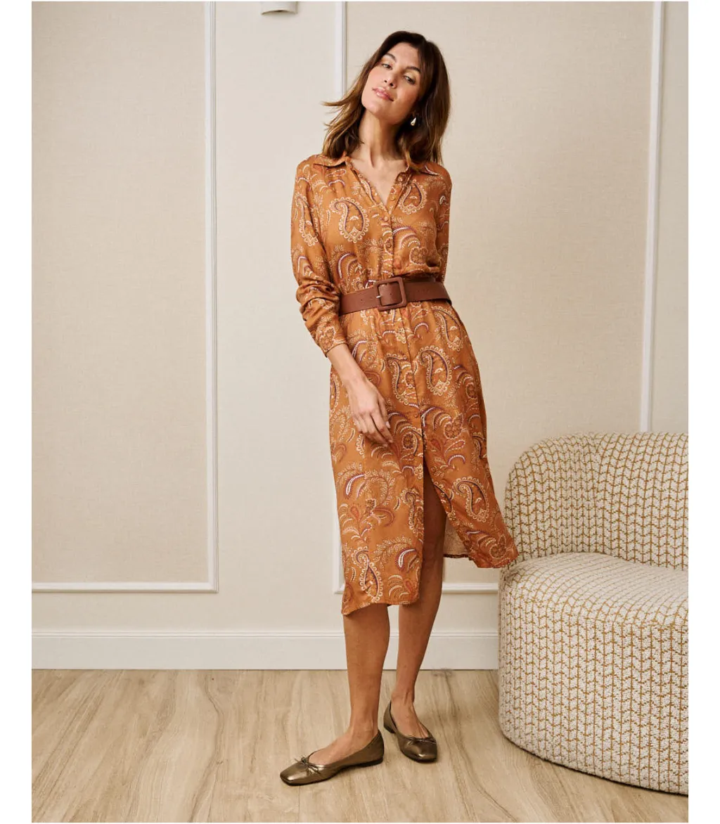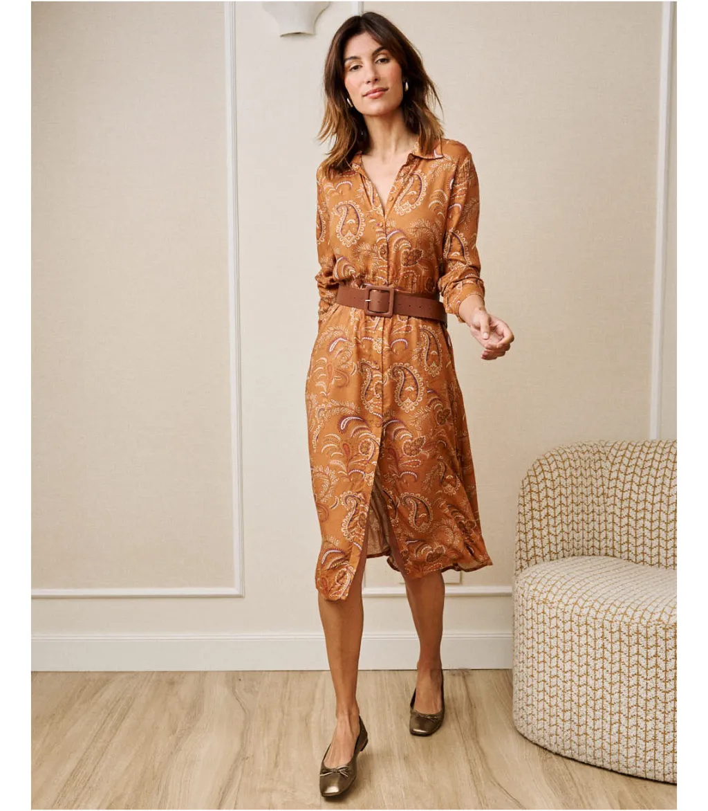 Vestido camisero midi con estampado en color teja. Vestido con cuello camisa. Modelo de manga larga terminada en puño, Vestido ajustado a la cintura mediante un cinturón del mismo tejido. Hilera de botones desde el cuello hasta el bajo. Falda midi con ligero vuelo. Vestido ideal para la lactancia y embarazo. El vestido con el que completar tu armario.Diseñado en España.