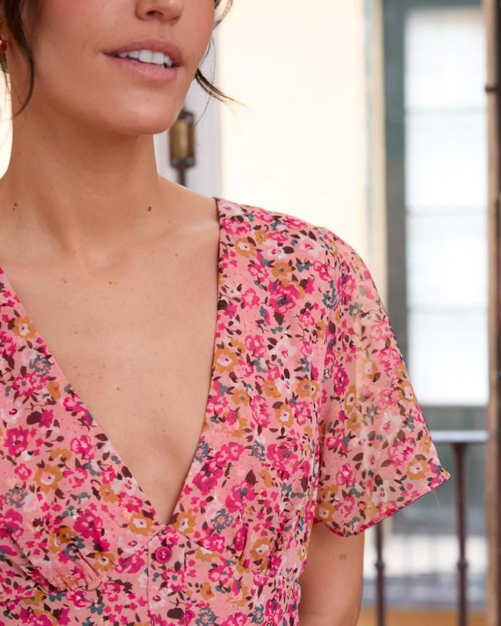 Vestido corto con estampado floral sobre un fondo en color rosa. Vestido con escote en pico y corte con drapeado bajo el pecho. Elástico a la cintura en la parte trasera. Manga corta estilo murciélago con ligero vuelo. Falda corta con ligero vuelo. Vestido ideal para la lactancia y primeros meses de embarazo. Ver másVer menos Referencia 179977 COMPOSICIÓN Y MEDIDAS:60% Poliéster, 40% ViscosaBego mide 1,80 cm y lleva la talla S. Si dudas en qué talla escoger, te recomendamos usar nuestro recomendador de tallas.CUIDADOS:Lavar a mano máximo a 30º. Ficha técnica Colores ROSAS Etiquetas: INA R2360 – ENVÍOS, CAMBIOS Y DEVOLUCIONES Favorito75 ENVÍOS:Todos los envíos cuentan con gastos de envío, que dependen de la dirección de entrega.• Península y Portugal: 3,50€ | 2-4 días laborables.• Baleares: 6,50€ | Hasta 7 días laborables.• Países de la Unión Europea: 10,95€ | Hasta 10 días laborables.• Envíos a Europa (No UE): 15,95€ | Hasta 10 días laborables.• Resto del mundo*: Aprox 10€ | Hasta 15 días laborables.*NO hacemos envíos a Canarias, Ceuta, Melilla, Afganistán, Bielorusia, Congo, Bali, Myanmar, Nigeria, Rusia, Senegal, Somalia y Ucrania.¡Importante! En periodo de rebajas, los pedidos pueden tardar un poco más de lo habitual ¡Rogamos paciencia!CAMBIOS: ¡El envío con el cambio solicitado es gratuito!Pedidos realizados desde España:Plazo de 14 días laborables desde que recibes el paquete en casa.Pedidos realizados desde fuera de España:Plazo de 20 días naturales desde que realizamos el envío.*La gestión del envío del paquete de vuelta a nuestro almacén corre a cuenta del cliente, haciéndose cargo de los costes de este envío, mediante el courier de su elección o con nuestro servicio de DHL.En el primer trámite de cambio, el envío de vuelta es gratuito (tanto de talla como de producto). Permitimos DOS trámites de cambio, en caso de querer tramitar un segundo cambio, se descontarán los gastos de envío según destino.Una vez recibido el paquete en nuestro almacén, tramitaremos tu cambio en un plazo máximo de hasta 10 días laborables. Recibirás un correo de confirmación cuando este pedido de cambio esté listo para ser enviado.