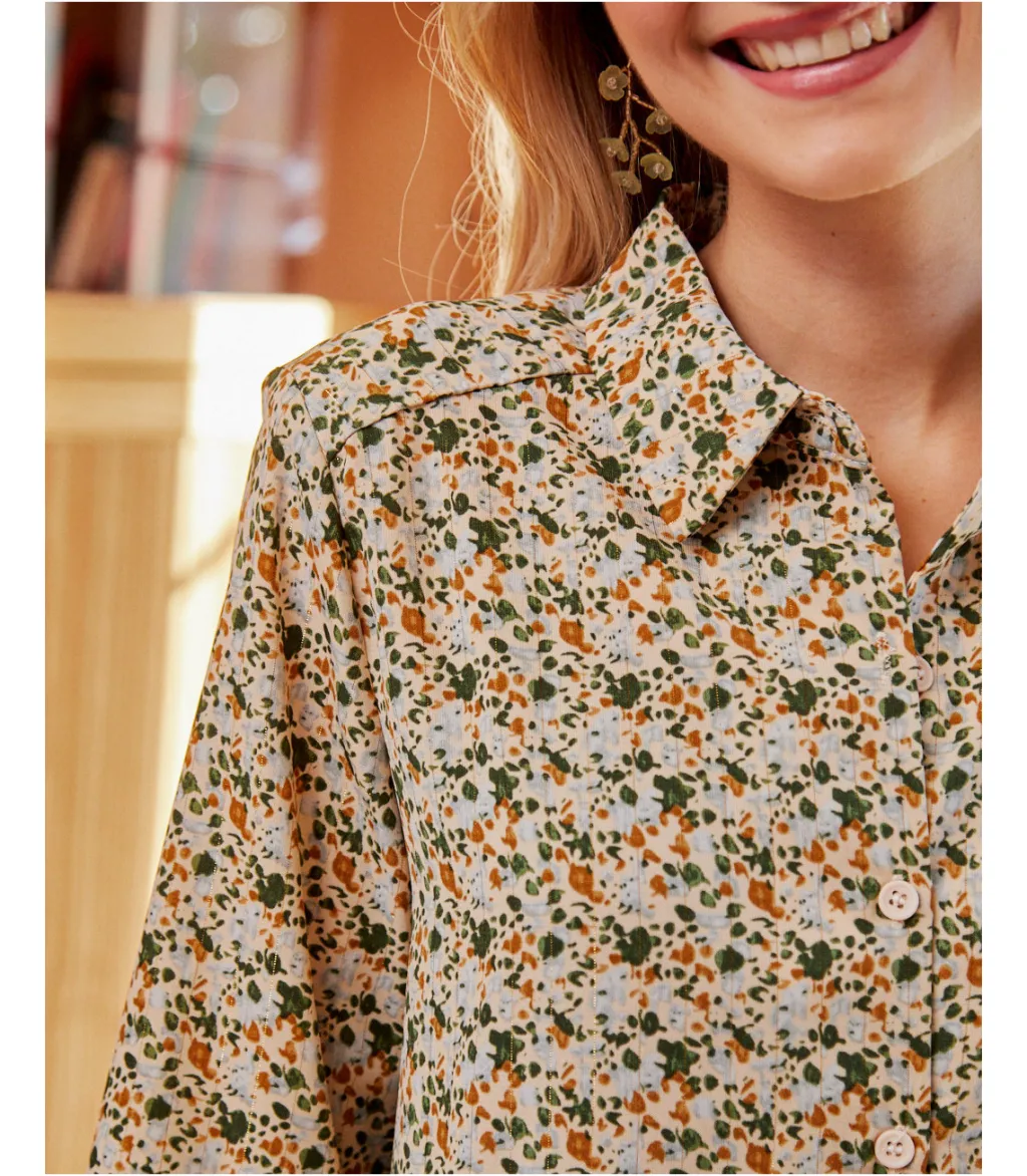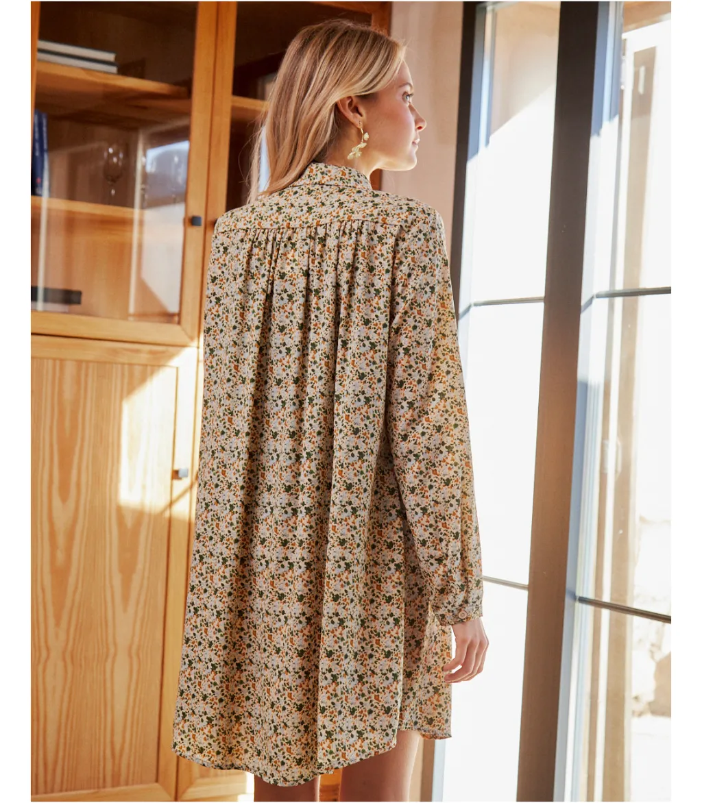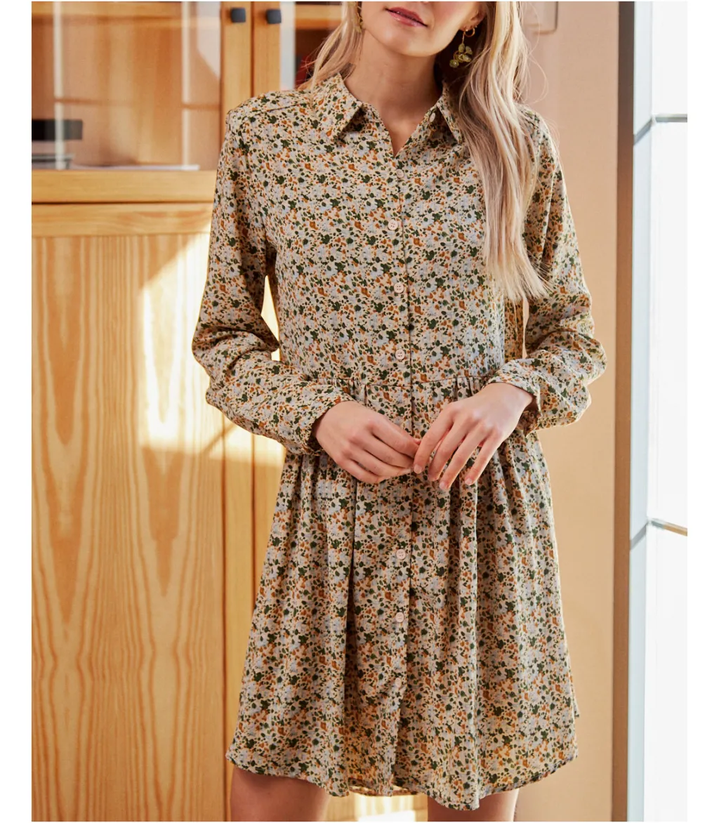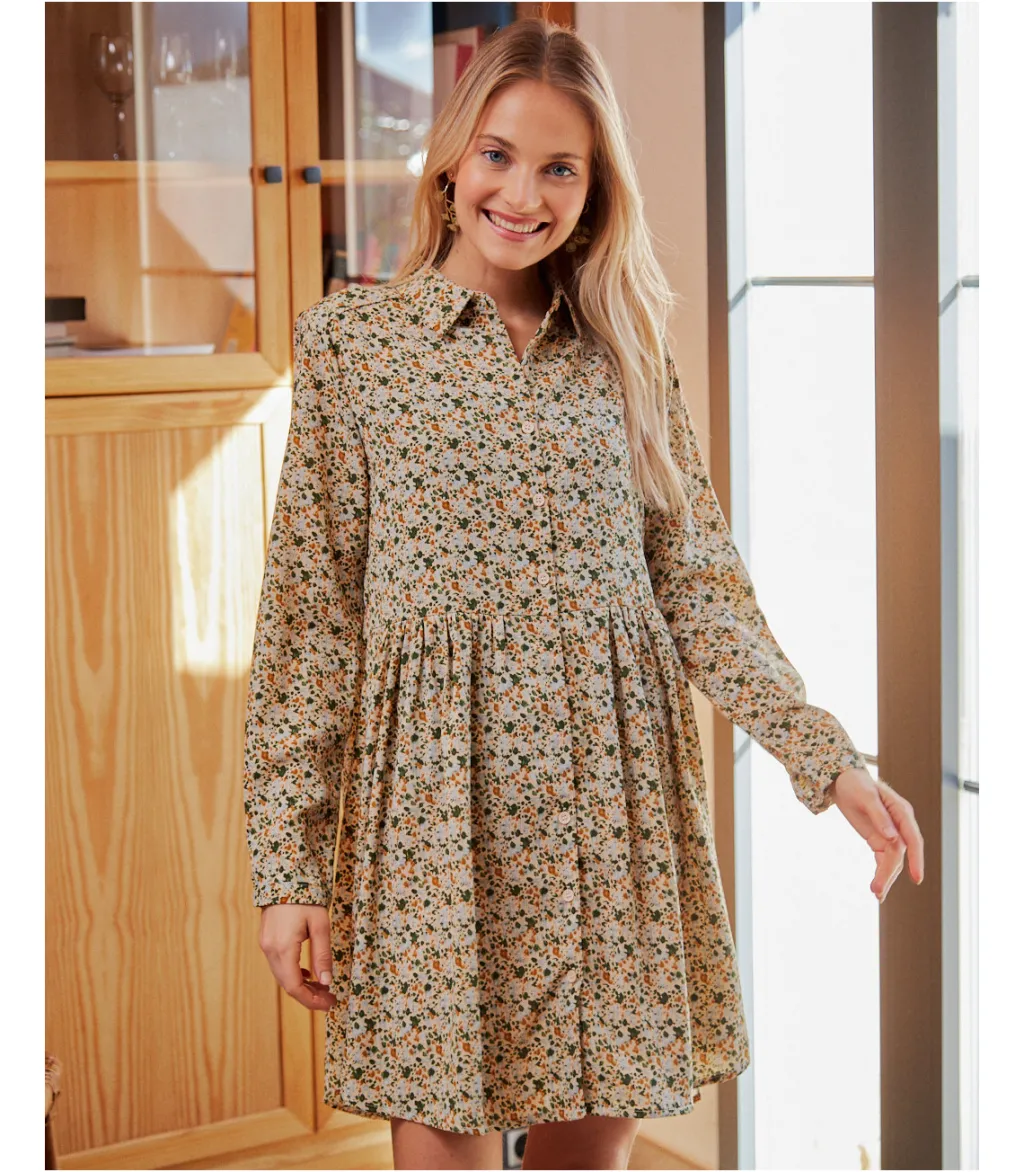 Vestido corto, estilo babydoll, con estampados en color oliva. Cuello de camisa e hilera de botones desde el cuello a la cintura. Prenda holgada, con corte en la cintura y finas líneas de lúrex. Diseño de manga larga. Falda corta con un ligero vuelo. Modelo ideal para el embarazo y la lactancia. Un vestido cómodo y alegre con el que disfrutar del día completo, de la mañana a la noche.